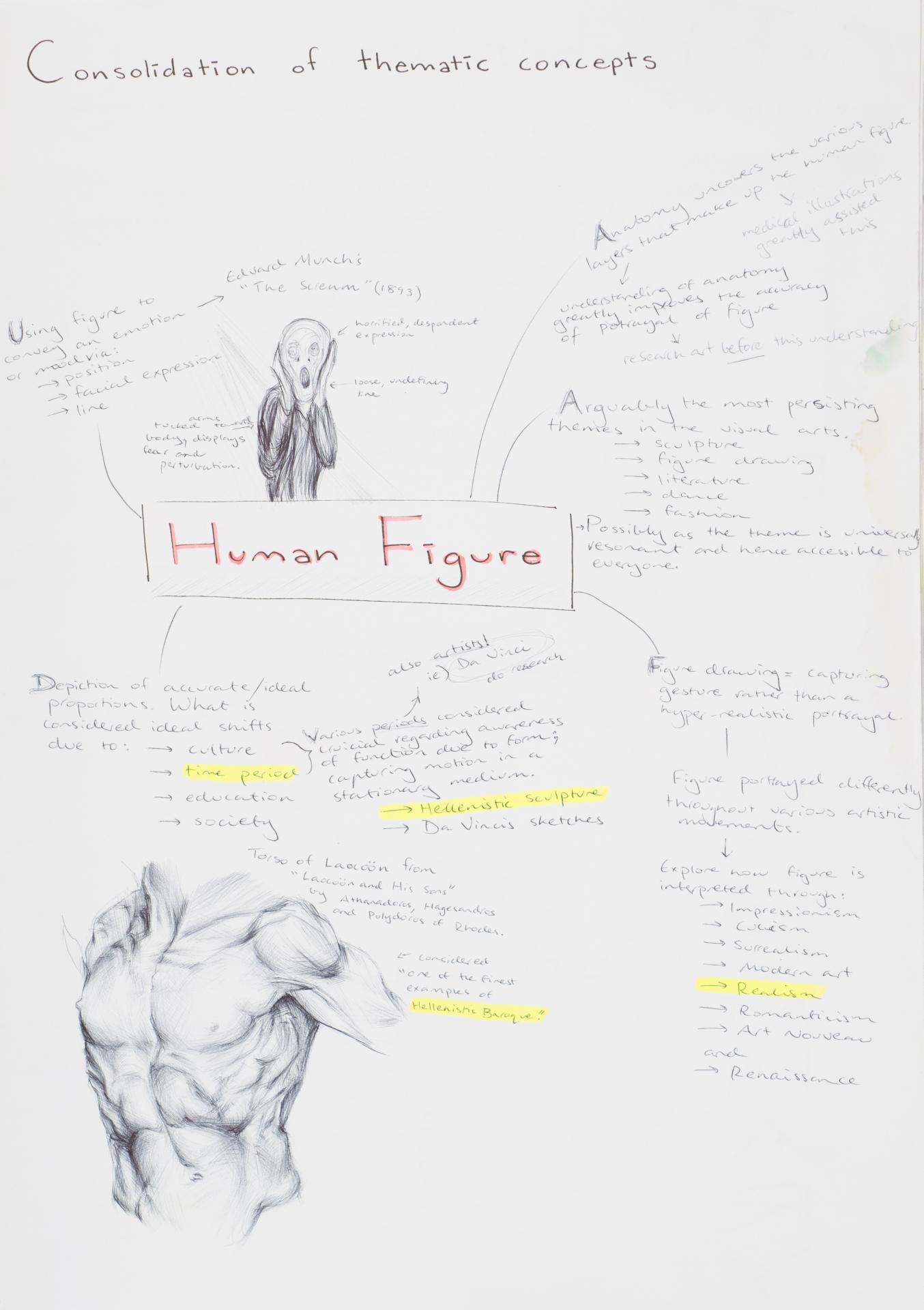 Criteria 1 requires a personal exploration of ideas and concepts. Cleopatra is exploring and refining her ideas through mind maps and small sketches. Her sketches are relevant to her intentions and she continues to consolidate her ideas.