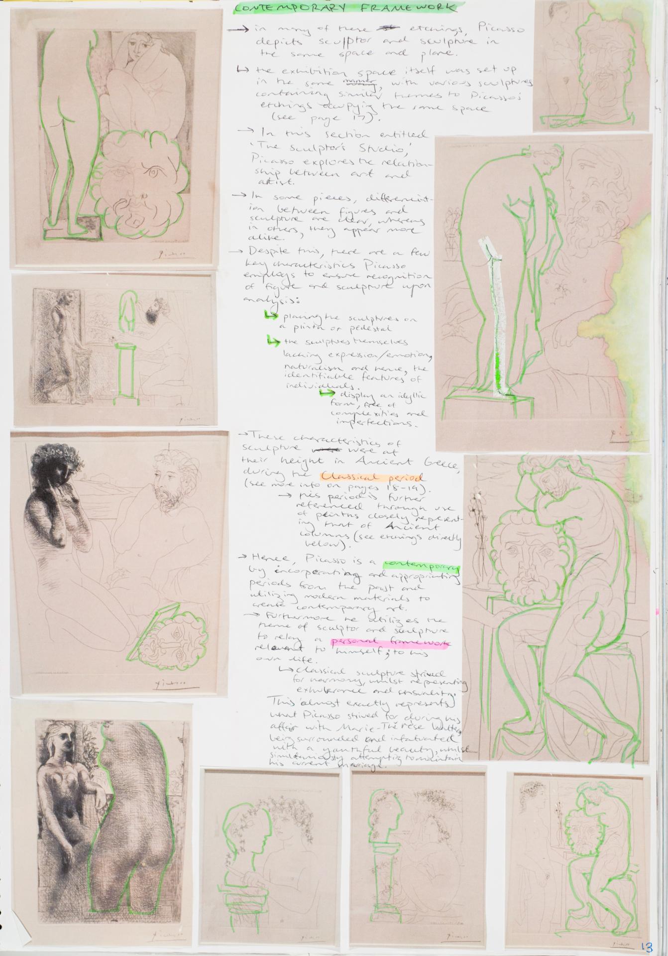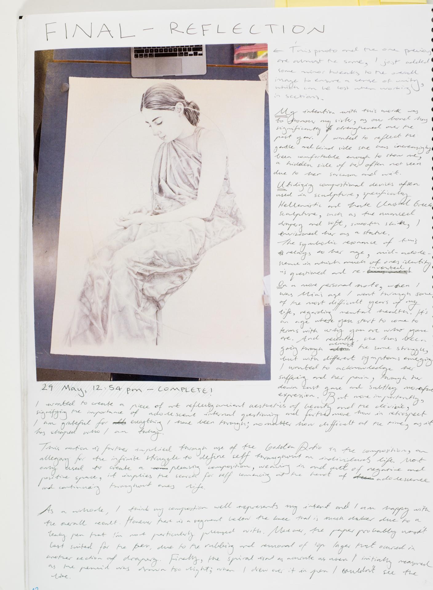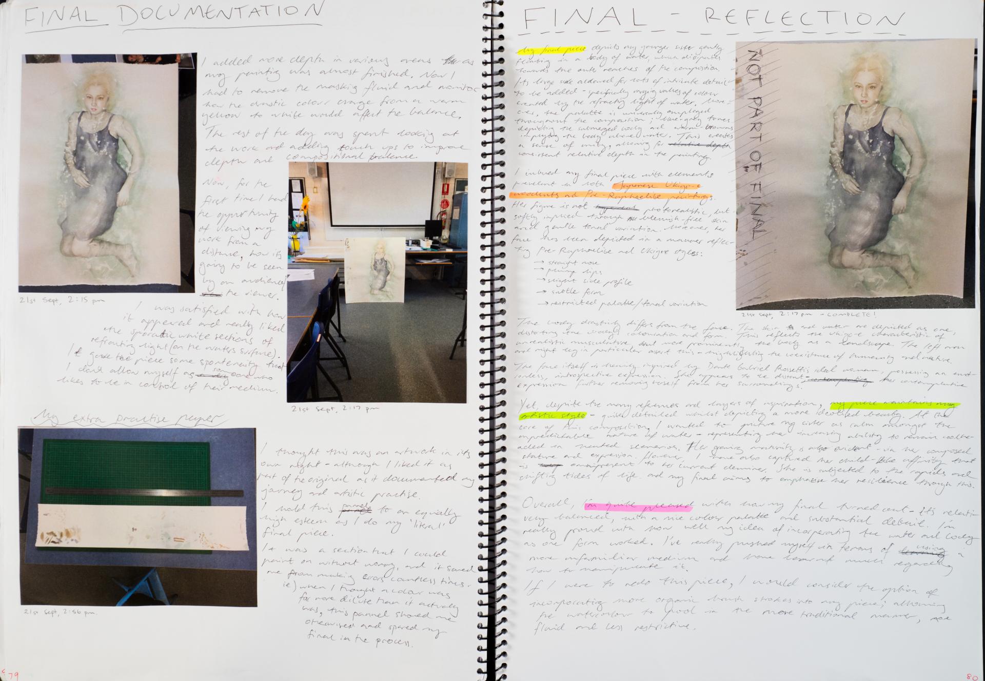 Cleopatra’s annotations demonstrate her understanding of the Analytical Frameworks and art terminology. She documents and evaluates her exploration throughout her artistic practice. She communicates her thinking and outlines potential areas for further exploration and improvement. She selects and uses headings to acknowledge the framework/s being applied.