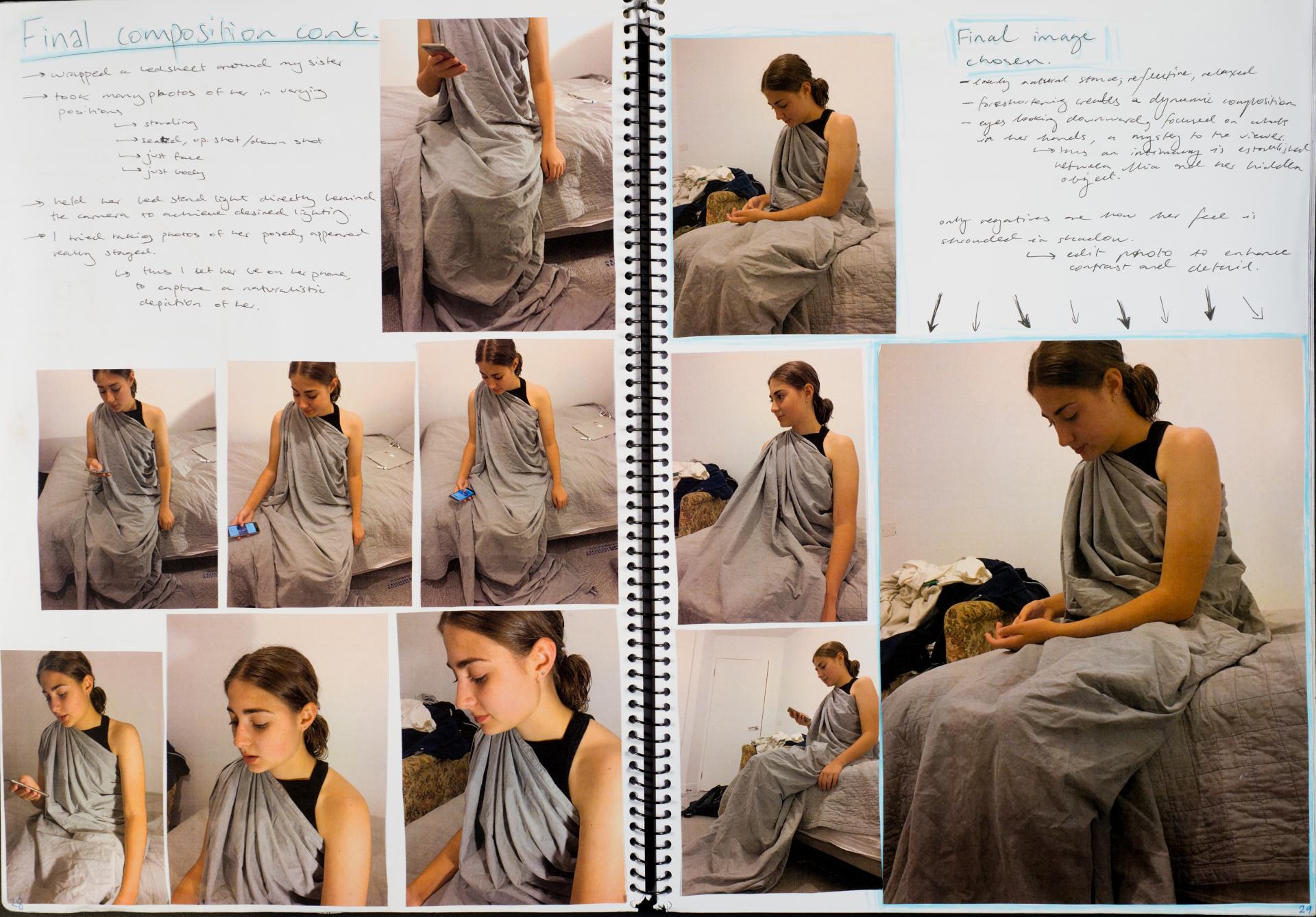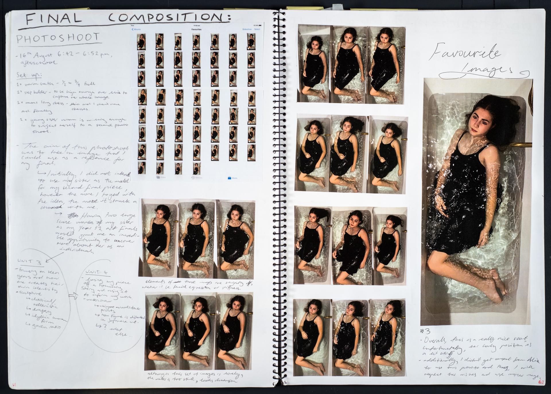 Students use Visual Language to communicate the exploration, development and resolution of artworks. They experiment with, and develop and refine, materials, techniques and processes. Cleopatra is exploring potential compositions by posing her model in different positions, changing camera angles and varying her zoom length. This helps her to develop and refine her visual language to best communicate her personal ideas and concepts.