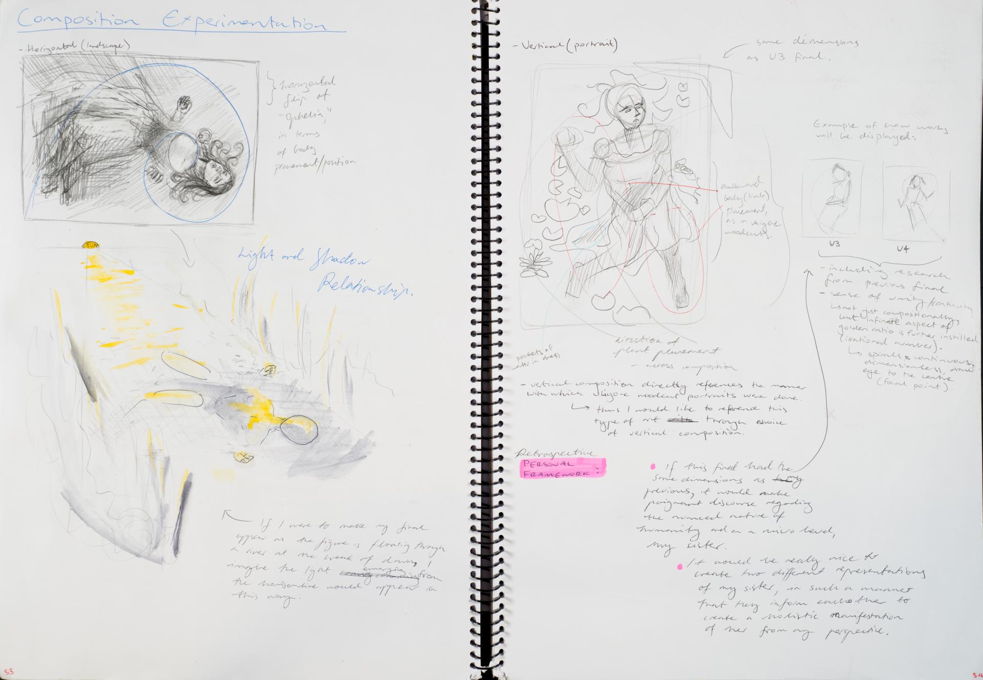 The development and application of materials and techniques from Unit 3 is being refined and resolved. Cleopatra is exploring her visual language with sketches and annotations. This assists in the development towards a refined, finished artwork that communicates her personal ideas and concepts.
