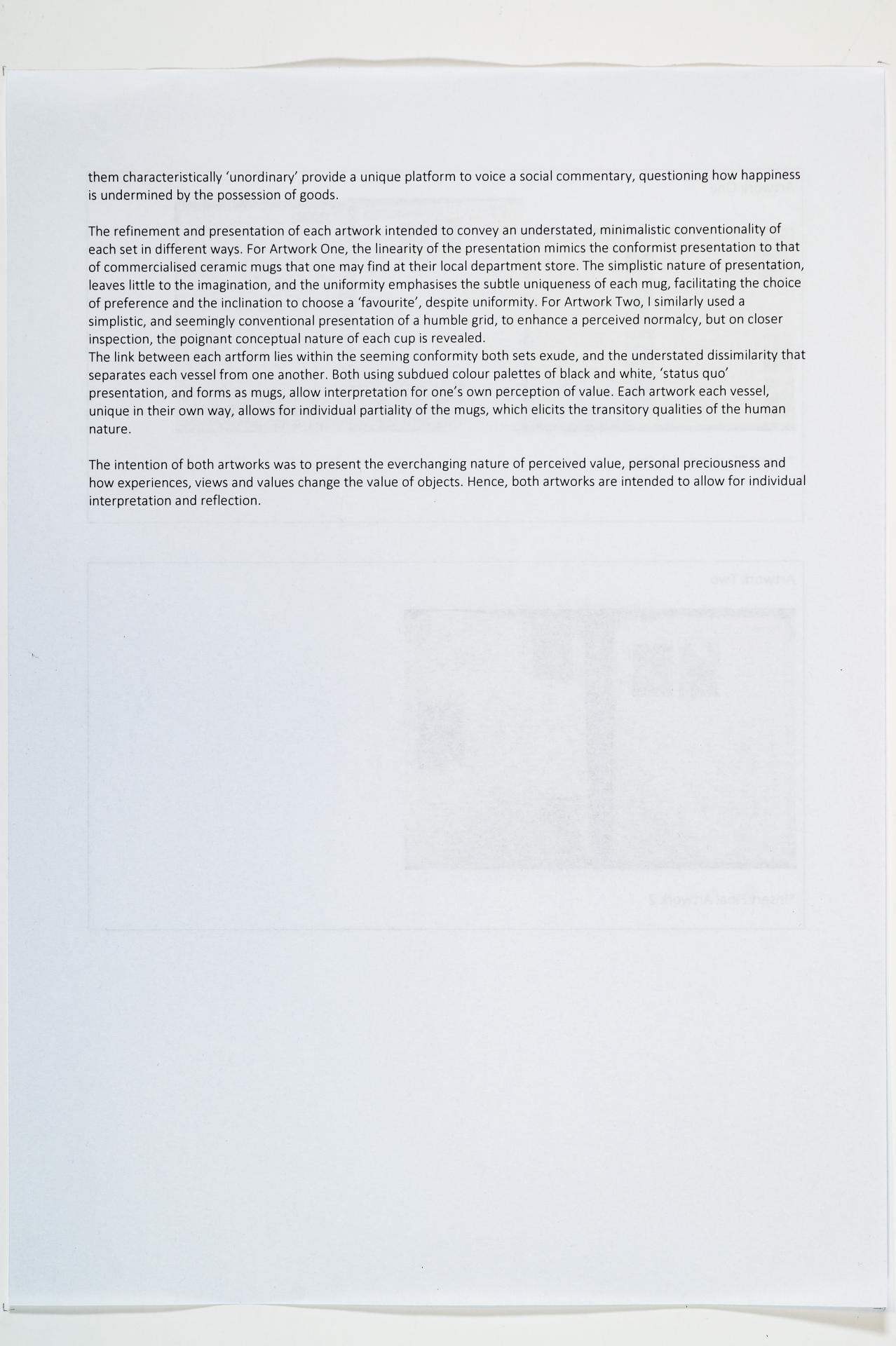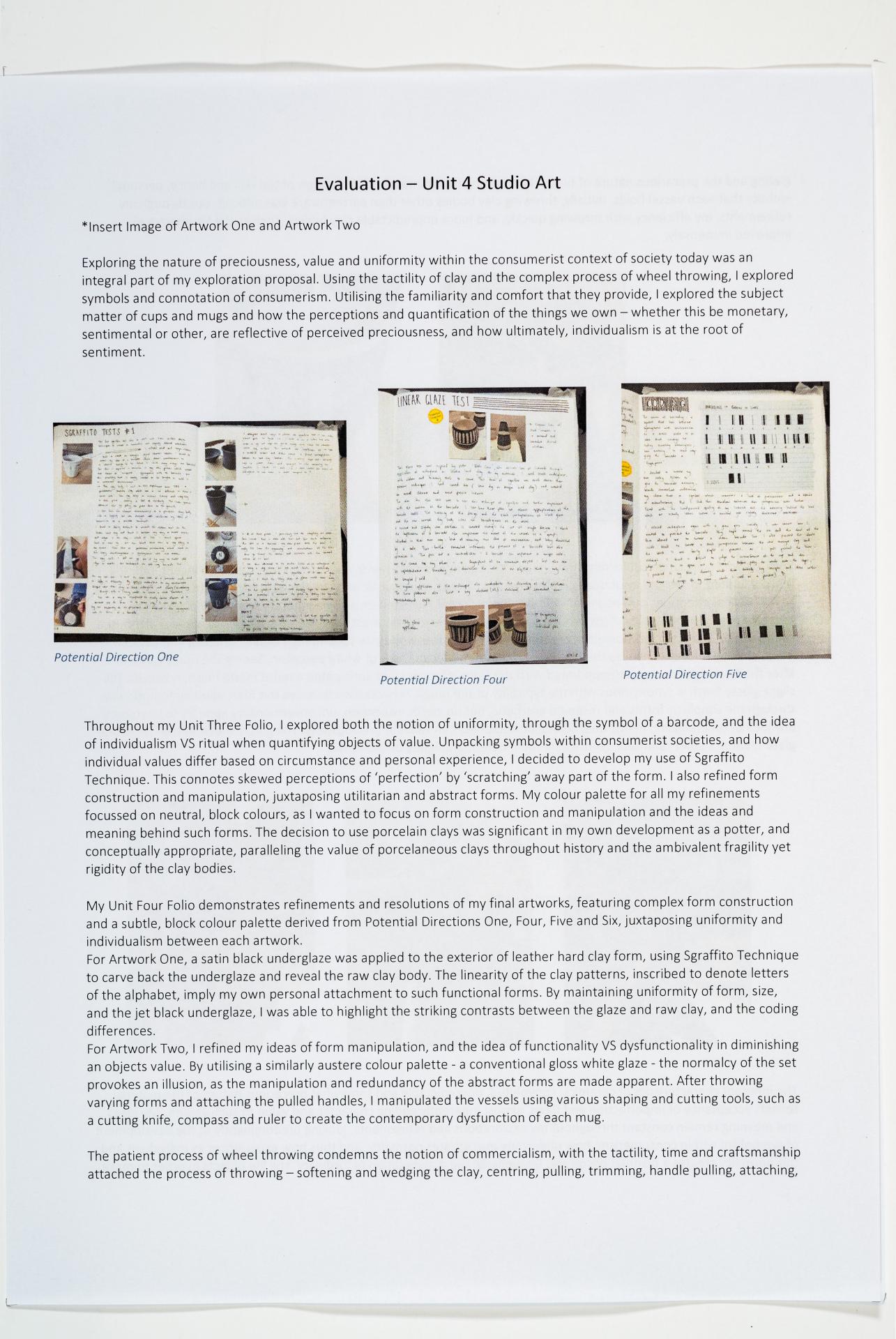 Olivia has identified and evaluated a range of potential directions to clarify and refine individual ideas in the studio process and concisely explain the development of future artworks.