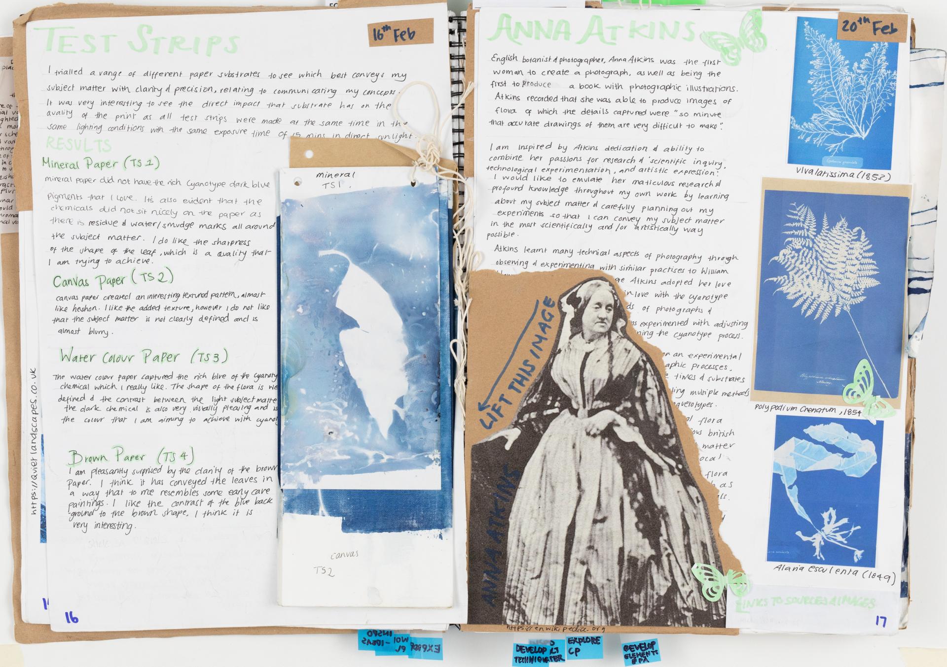Grace explores and experiments with materials, techniques and processes in the art form of photography. She develops subject matter and ideas from the exploration of artistic influences, inspiration and personal responses in her Visual Arts journal. In this example Grace has trialed different papers with cyanotypes. She has documented the processes referring to her artistic inspiration and how effectively the trials communicate her ideas.