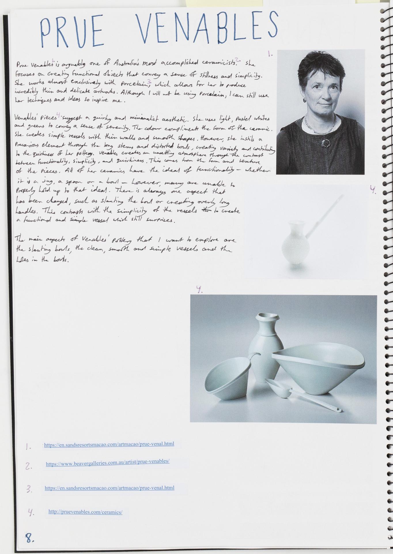 Michael has researched, collated and documented in his Visual Arts journal the exploration of at least three artist and artworks in specific artforms. He has identified and analysed the connections between the artworks and his ideas. He has also analysed the use of visual language in the artworks.