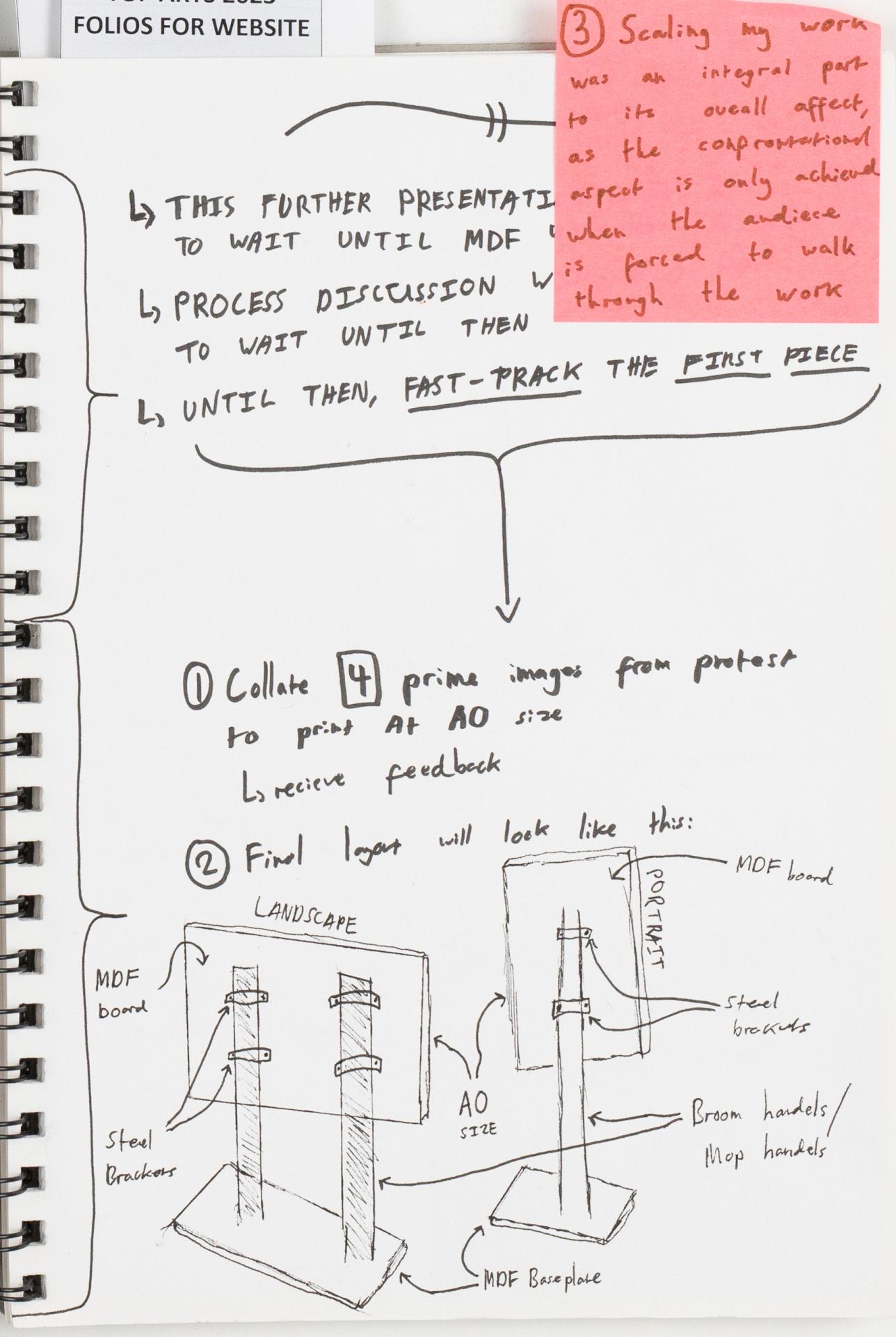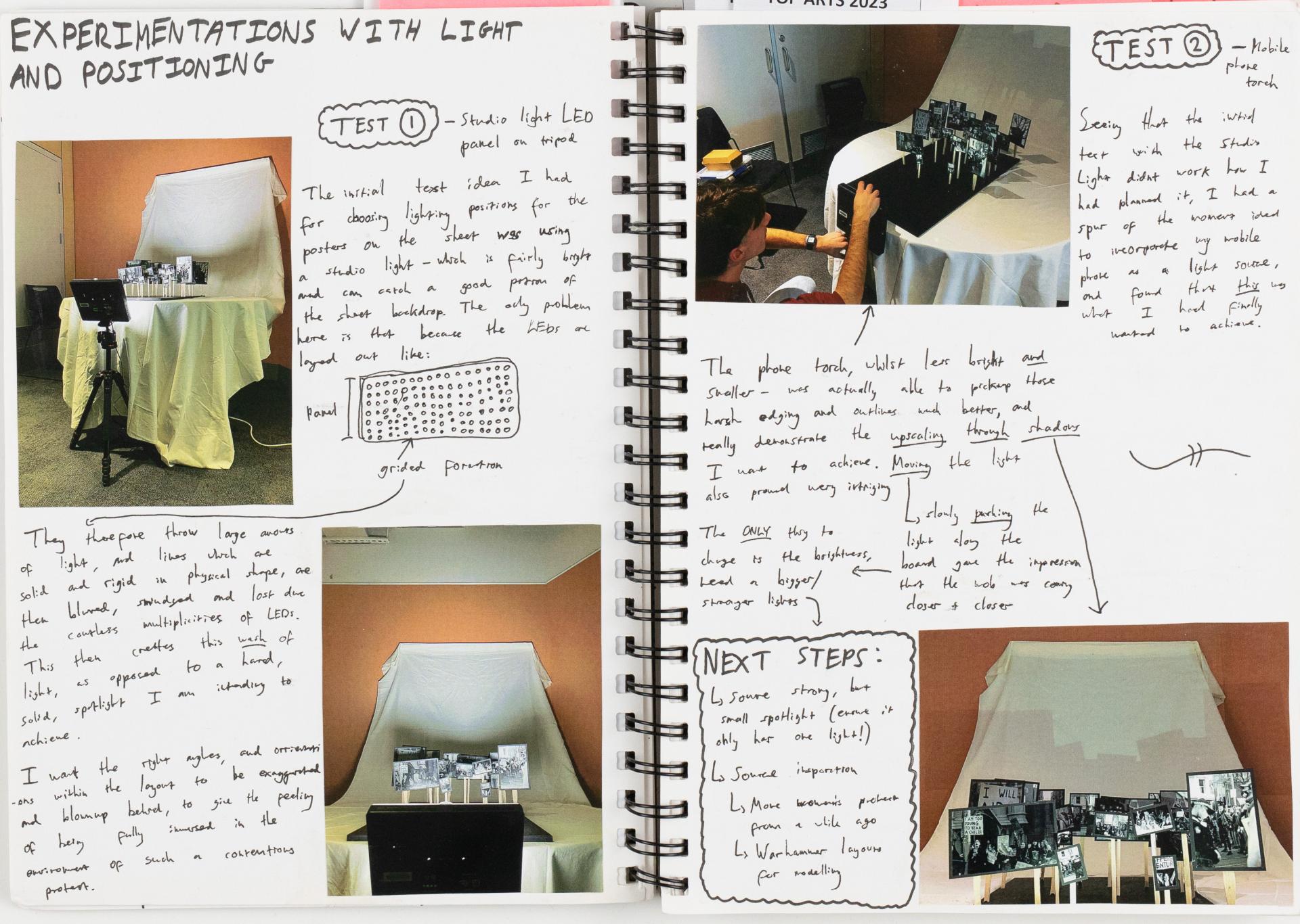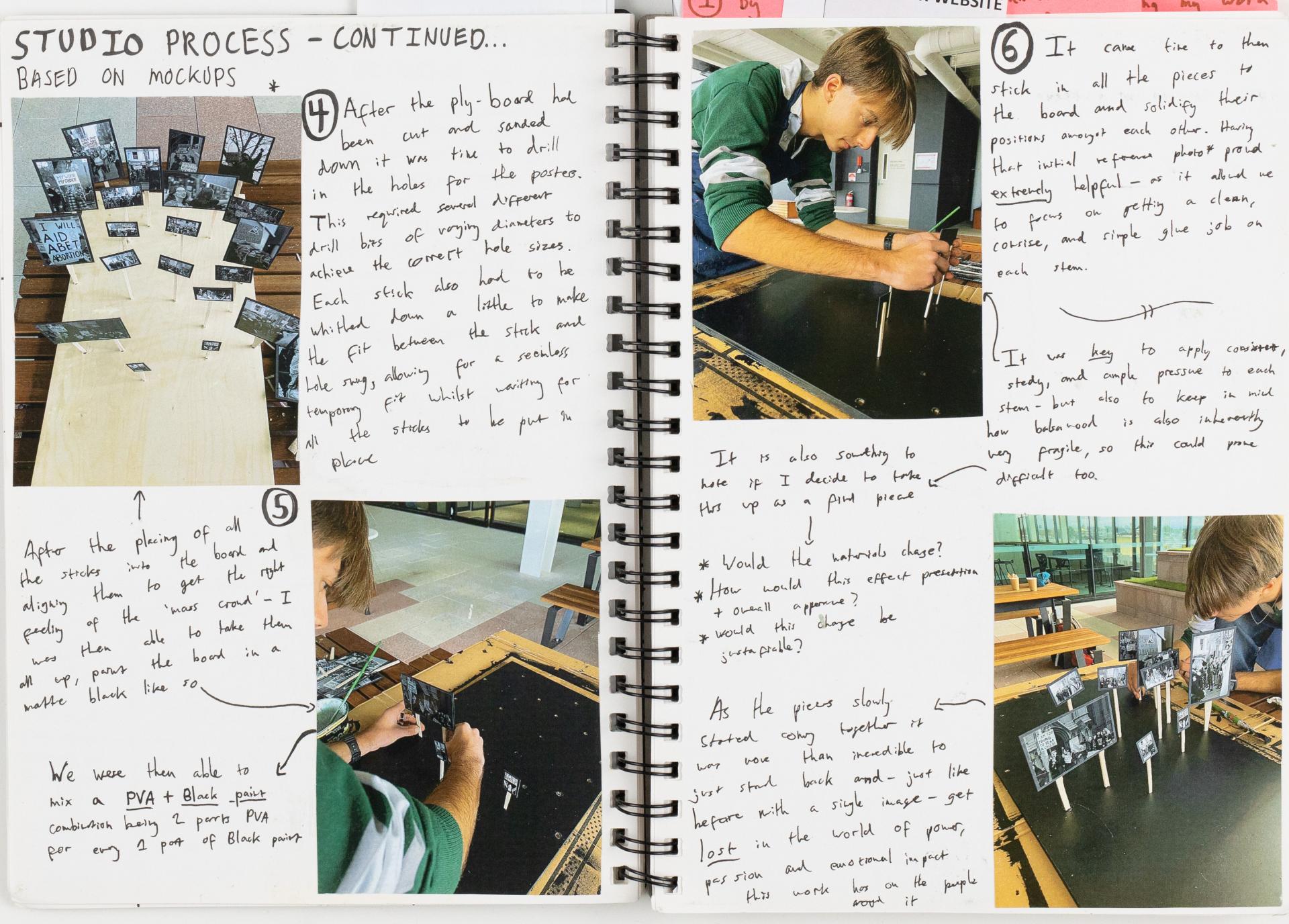 Milo documented the exploration of materials and techniques to develop a visual language. He explored, experimented with and resolved personal visual responses influenced by specific ideas and issues. In this example, Milo is exploring the presentation of their artwork.