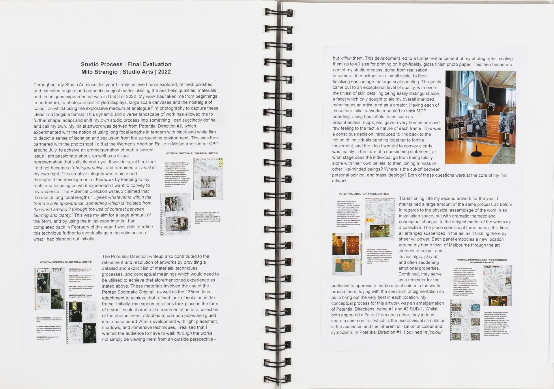 Milo explored his selected artform of photography to develop Visual language that communicated his ideas. Milo’s documentation included critically reflective annotation and that progressively evaluated the development of their artwork. Using the Creative Practice Milo could have applied the Structural and Cultural lenses to evaluate his personal responses.