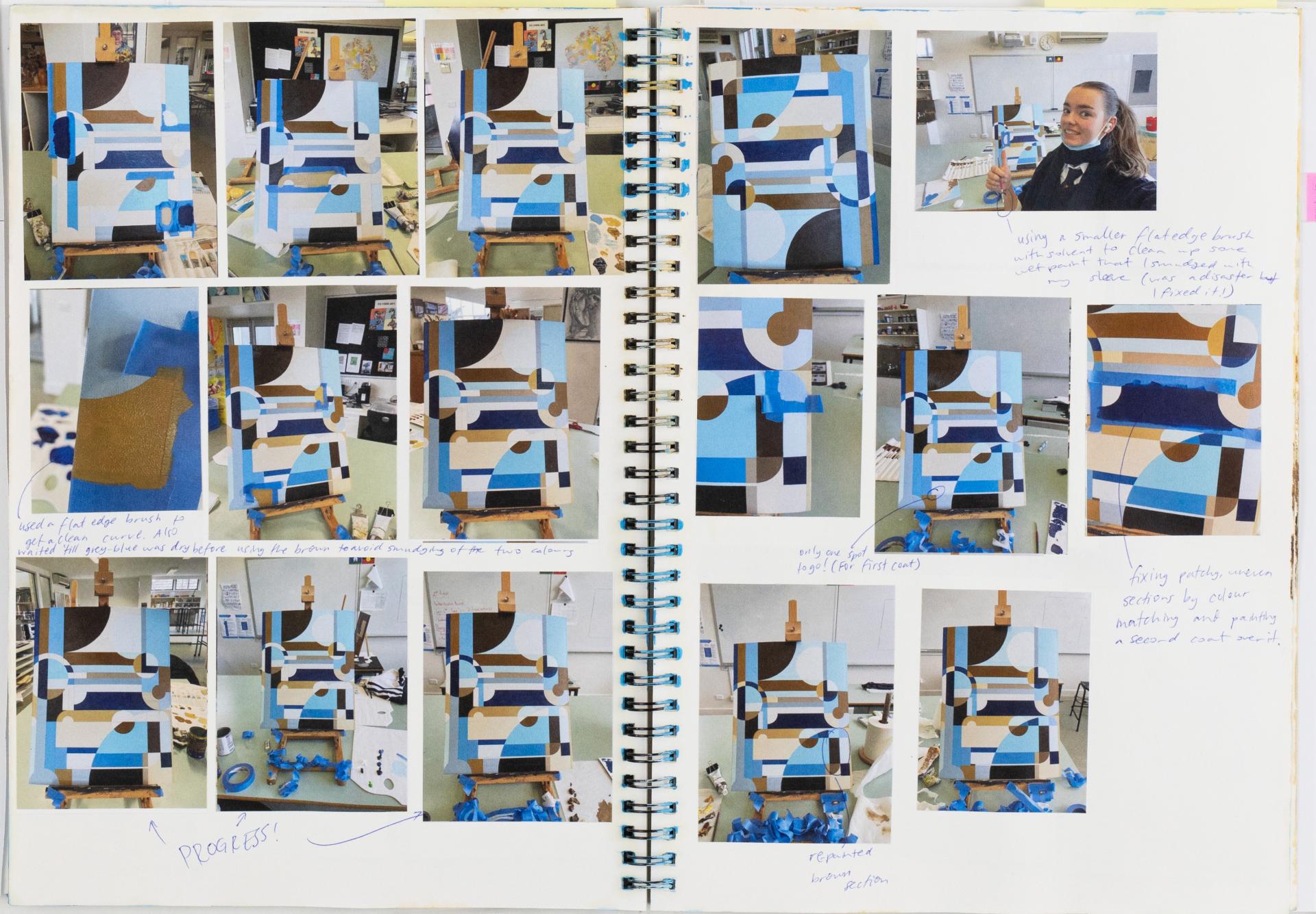 Stephanie has progressively documented and recorded the resolution and refinement using written and visual documentation of at least one finished artwork. She identifies materials and techniques used in her paintings. The images document the step-by-step process of painting to authenticate her work.