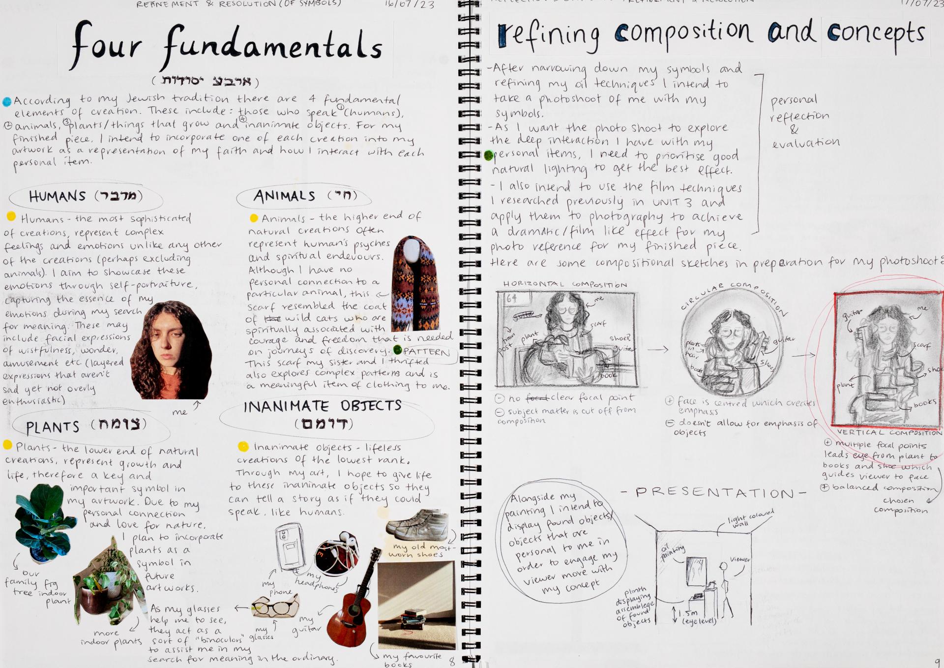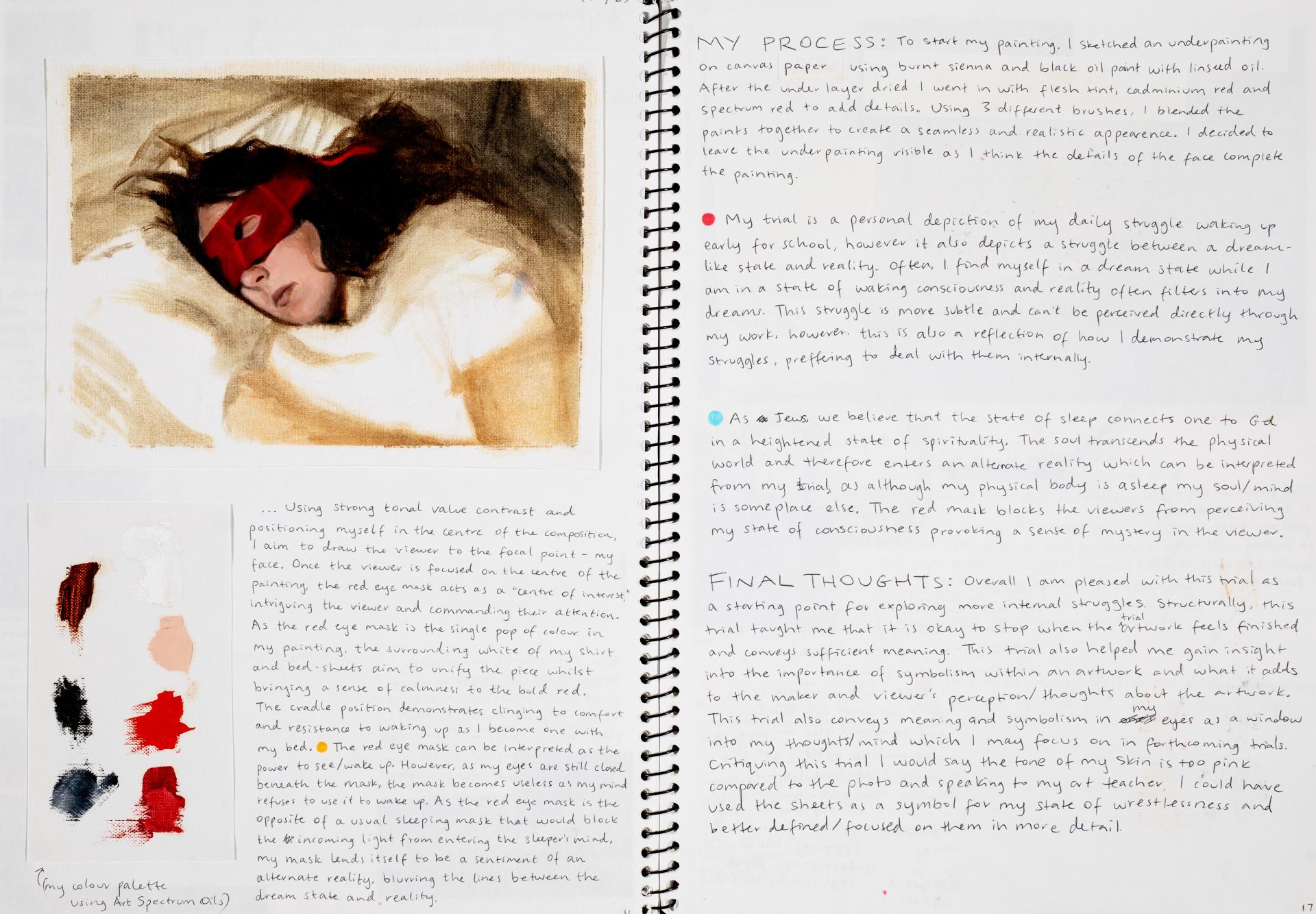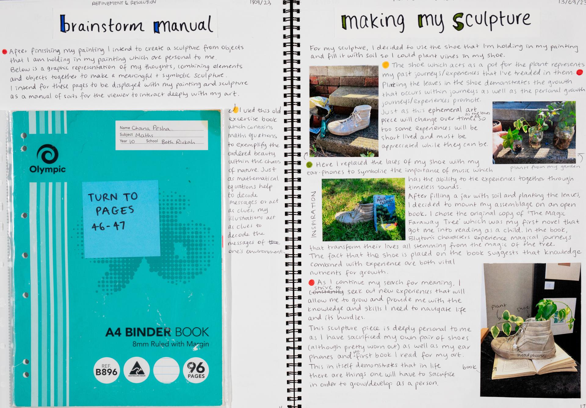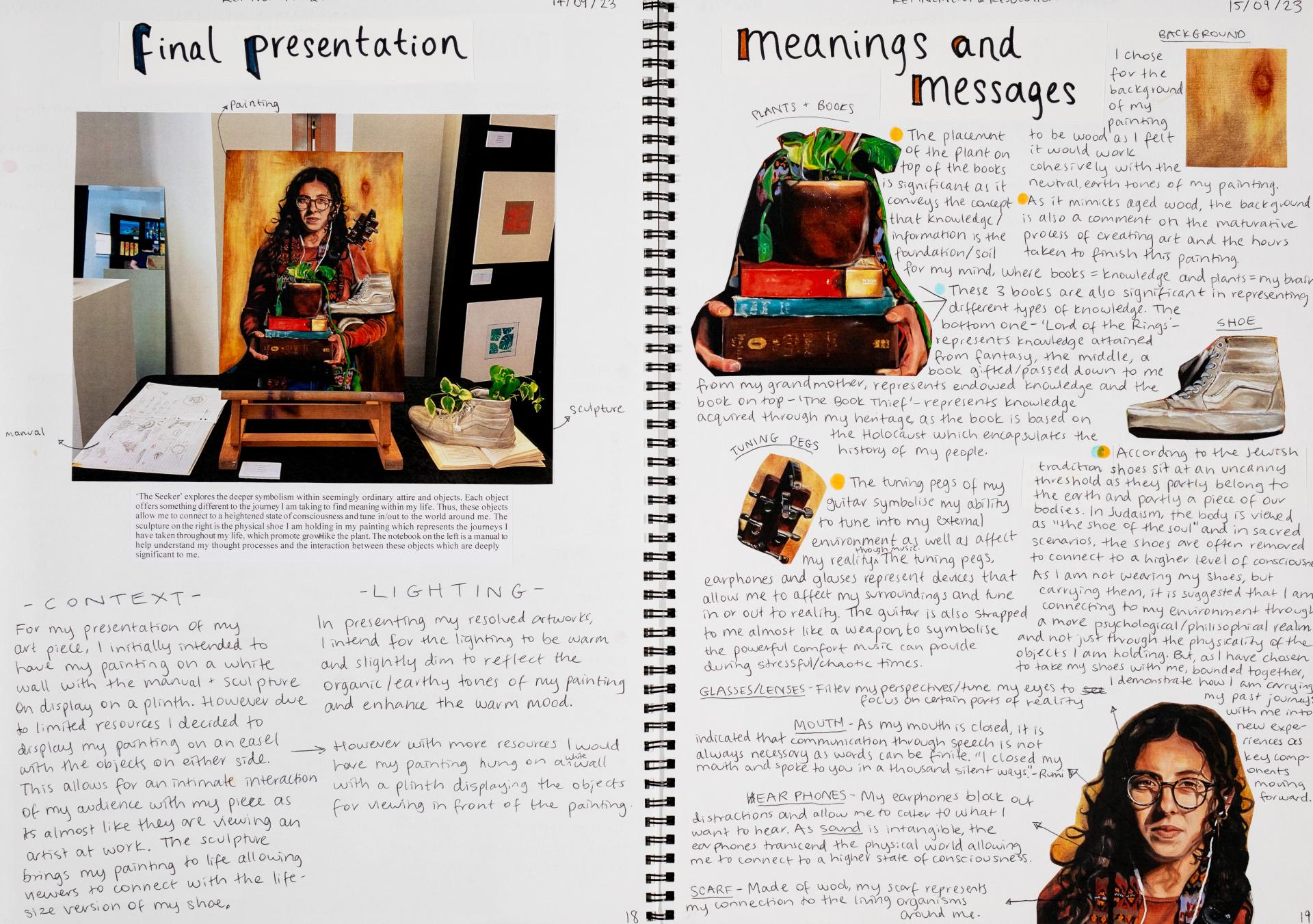 In Unit 4 Chana presented one finished artwork that resolved her intentions. The context of this work and how the audience engaged with it was an important consideration for her. Rather than presenting the painting in a traditional context, hanging on a gallery wall, Chana wanted the audience to “interact deeply” with her work. She considered how the presentation of the Body of Work could effectively communicate ideas and meaning to a viewer or audience. She paid attention to symbolism and how she could provide clues to “decode the messages” she wished to convey. She evaluated the presentation of her Body of Work and how she could make it more effective in the way it communicated ideas and meaning to the audience. This was done through the reflective annotations, and it referenced the objects that were added to the presentation after the painting was completed and how these were placed.