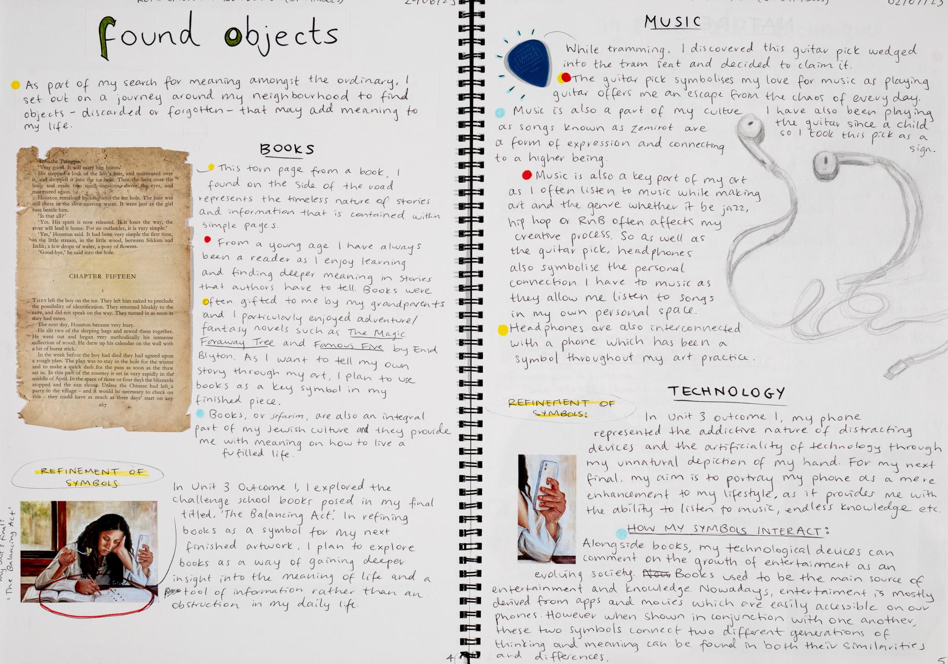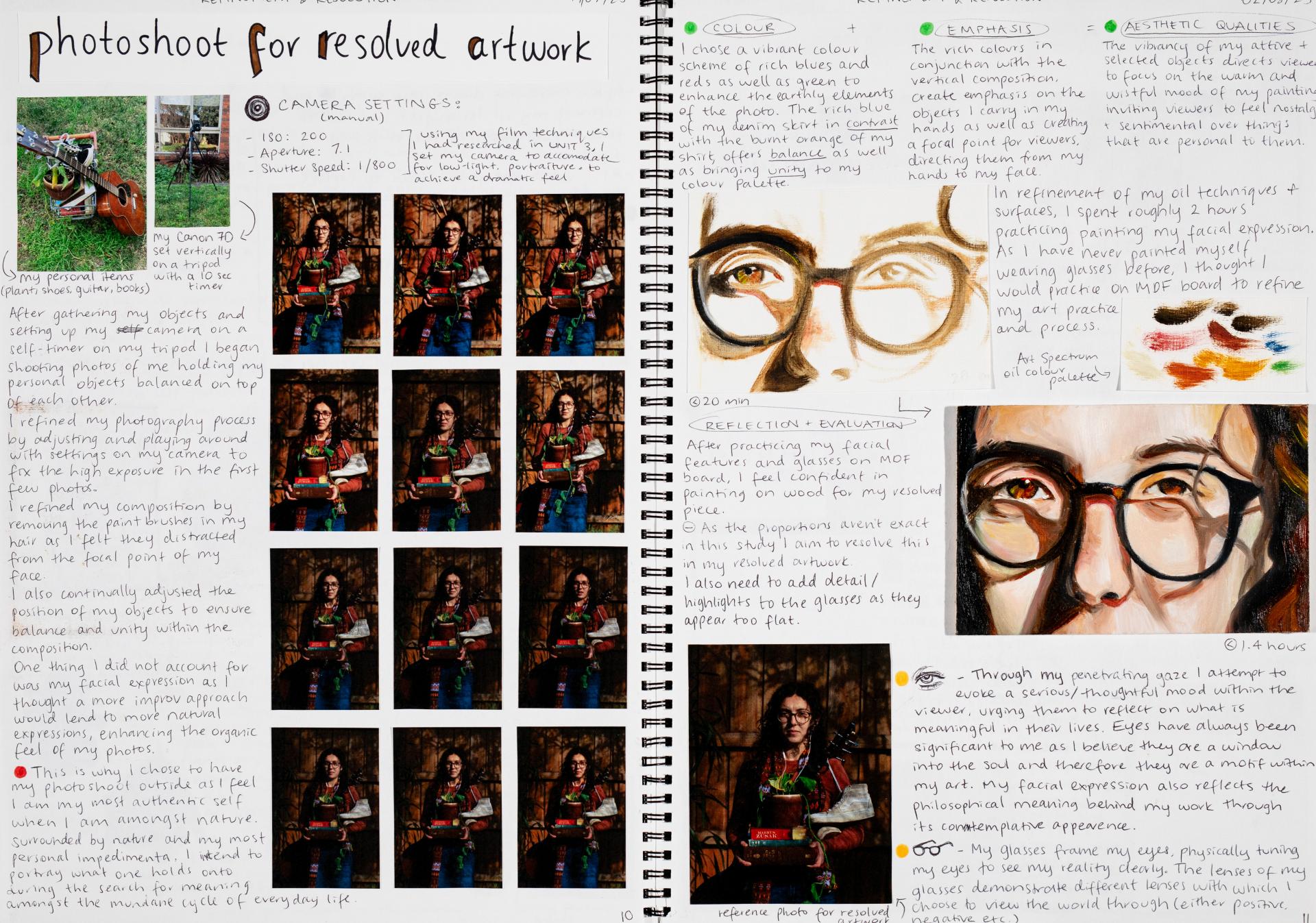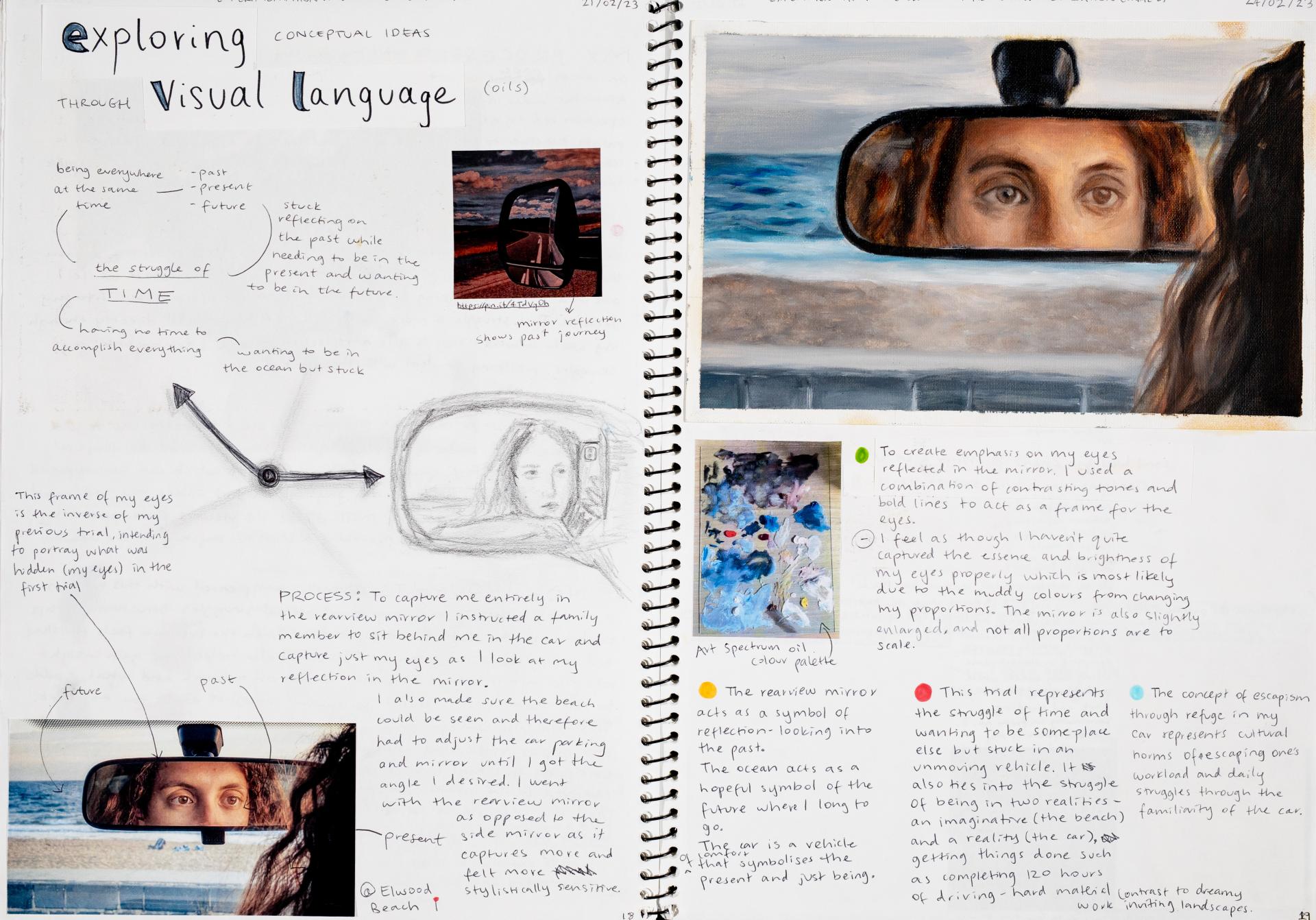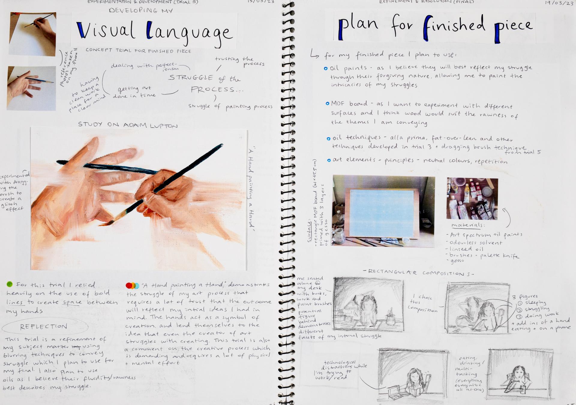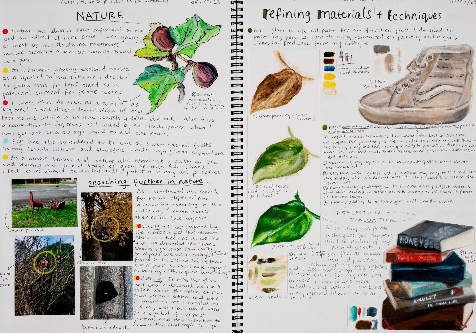 In Unit 4 Chana presented one finished artwork that resolved her intentions. The context of this work and how the audience engaged with it was an important consideration for her. Rather than presenting the painting in a traditional context, hanging on a gallery wall, Chana wanted the audience to “interact deeply” with her work. She considered how the presentation of the Body of Work could effectively communicate ideas and meaning to a viewer or audience. She paid attention to symbolism and how she could provide clues to “decode the messages” she wished to convey. She evaluated the presentation of her Body of Work and how she could make it more effective in the way it communicated ideas and meaning to the audience. This was done through the reflective annotations, and it referenced the objects that were added to the presentation after the painting was completed and how these were placed.