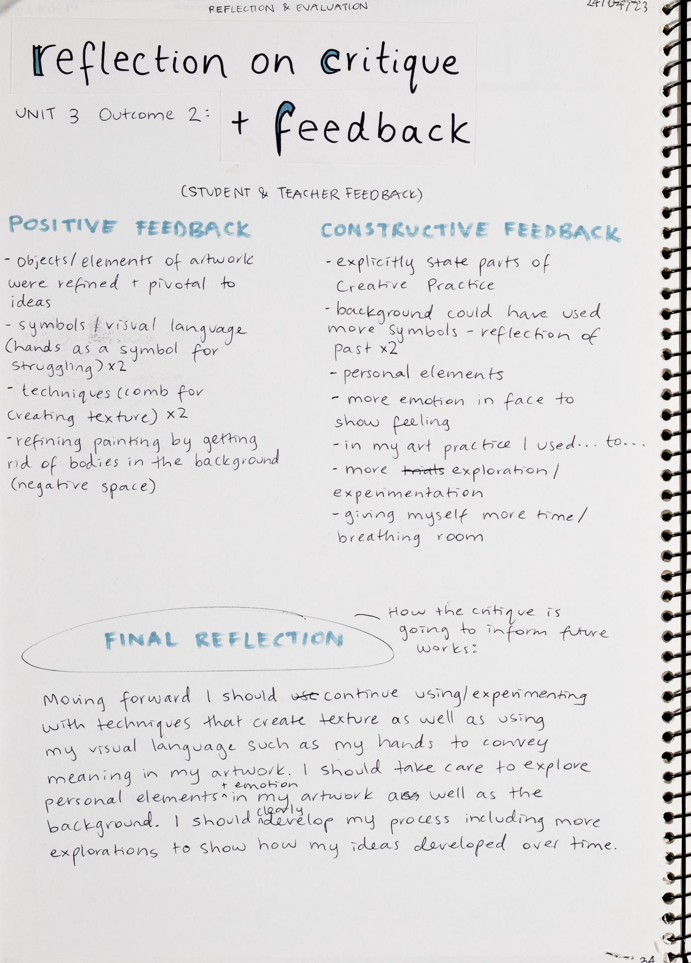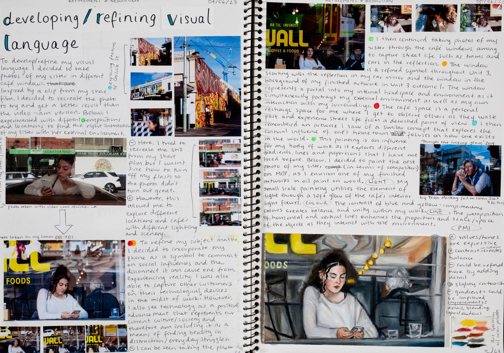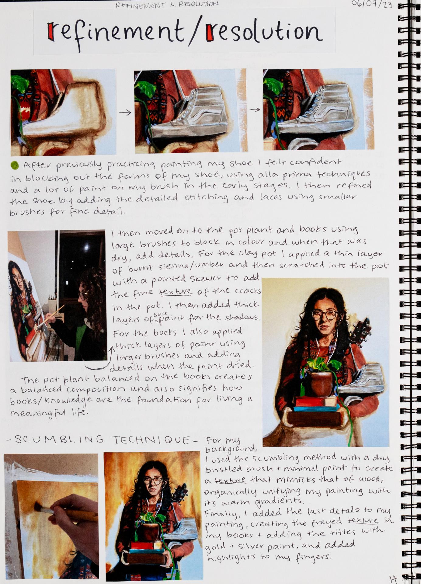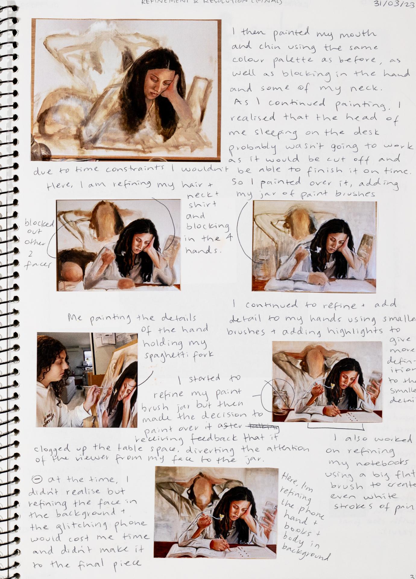 In Unit 4 Chana presented one finished artwork that resolved her intentions. The context of this work and how the audience engaged with it was an important consideration for her. Rather than presenting the painting in a traditional context, hanging on a gallery wall, Chana wanted the audience to “interact deeply” with her work. She considered how the presentation of the Body of Work could effectively communicate ideas and meaning to a viewer or audience. She paid attention to symbolism and how she could provide clues to “decode the messages” she wished to convey. She evaluated the presentation of her Body of Work and how she could make it more effective in the way it communicated ideas and meaning to the audience. This was done through the reflective annotations, and it referenced the objects that were added to the presentation after the painting was completed and how these were placed.