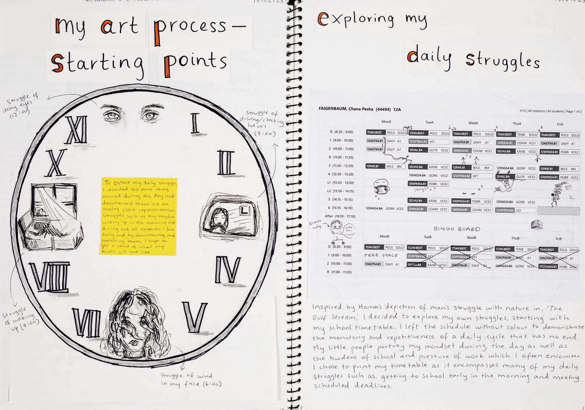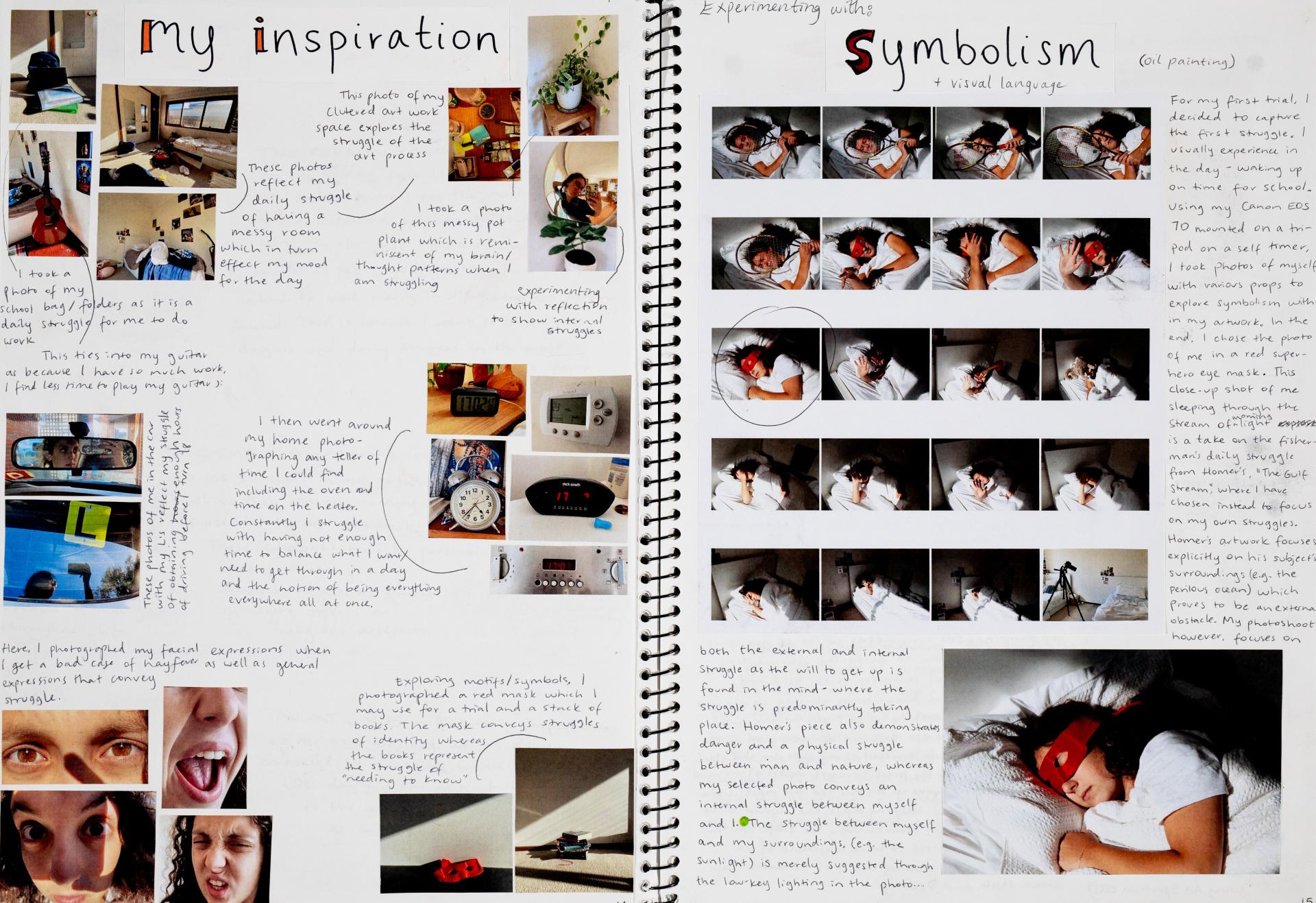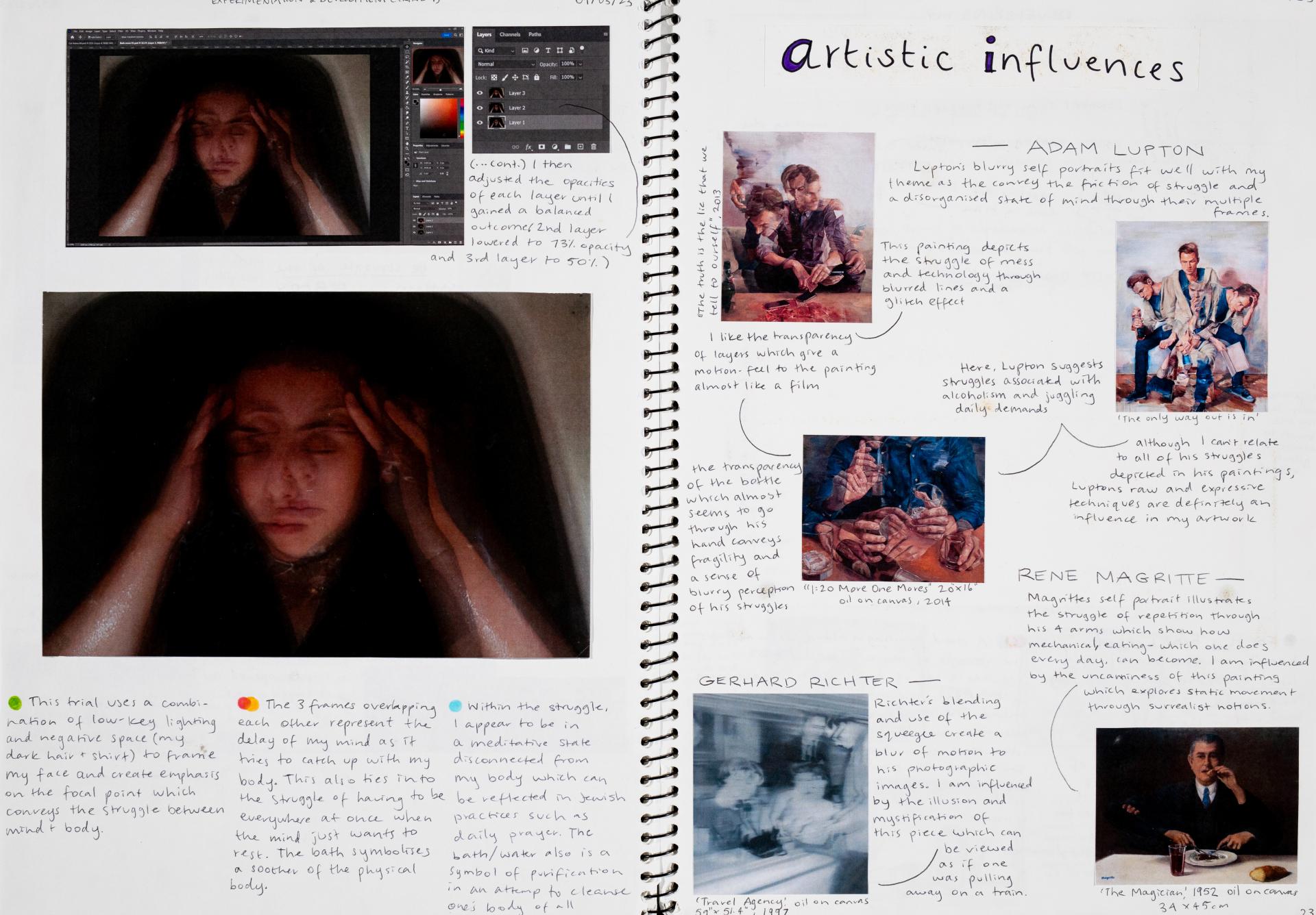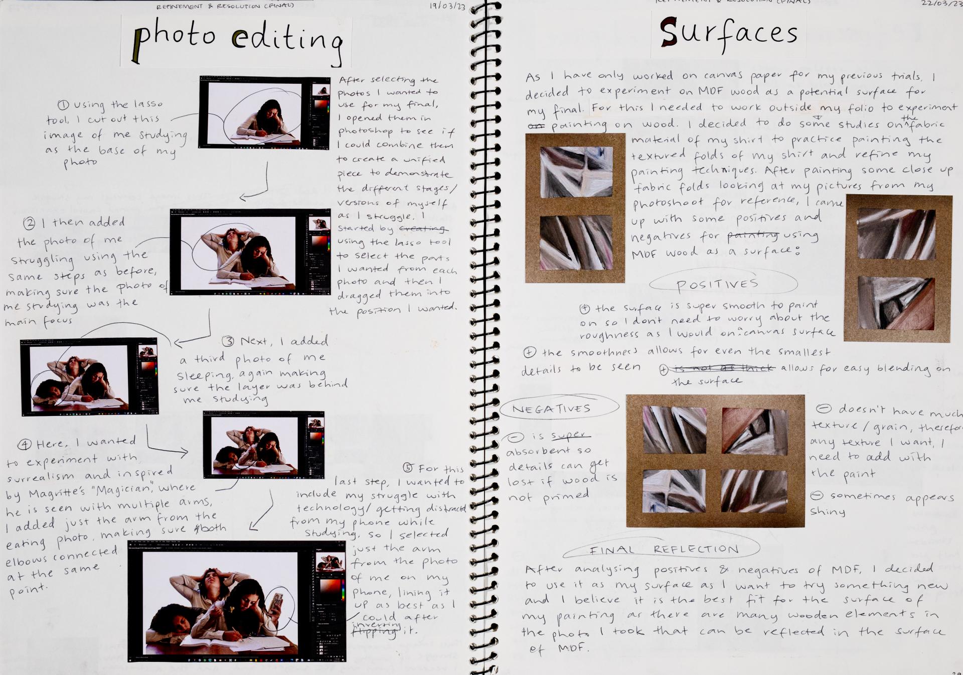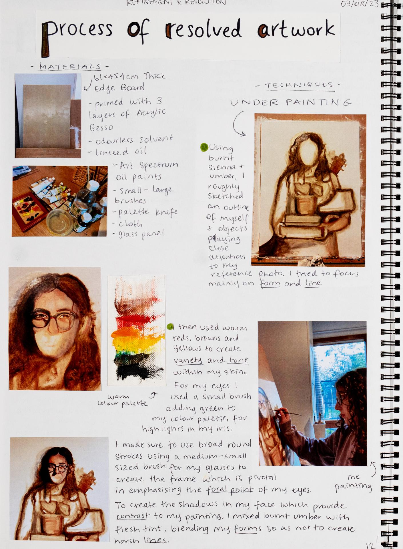 In Unit 4 Chana presented one finished artwork that resolved her intentions. The context of this work and how the audience engaged with it was an important consideration for her. Rather than presenting the painting in a traditional context, hanging on a gallery wall, Chana wanted the audience to “interact deeply” with her work. She considered how the presentation of the Body of Work could effectively communicate ideas and meaning to a viewer or audience. She paid attention to symbolism and how she could provide clues to “decode the messages” she wished to convey. She evaluated the presentation of her Body of Work and how she could make it more effective in the way it communicated ideas and meaning to the audience. This was done through the reflective annotations, and it referenced the objects that were added to the presentation after the painting was completed and how these were placed.