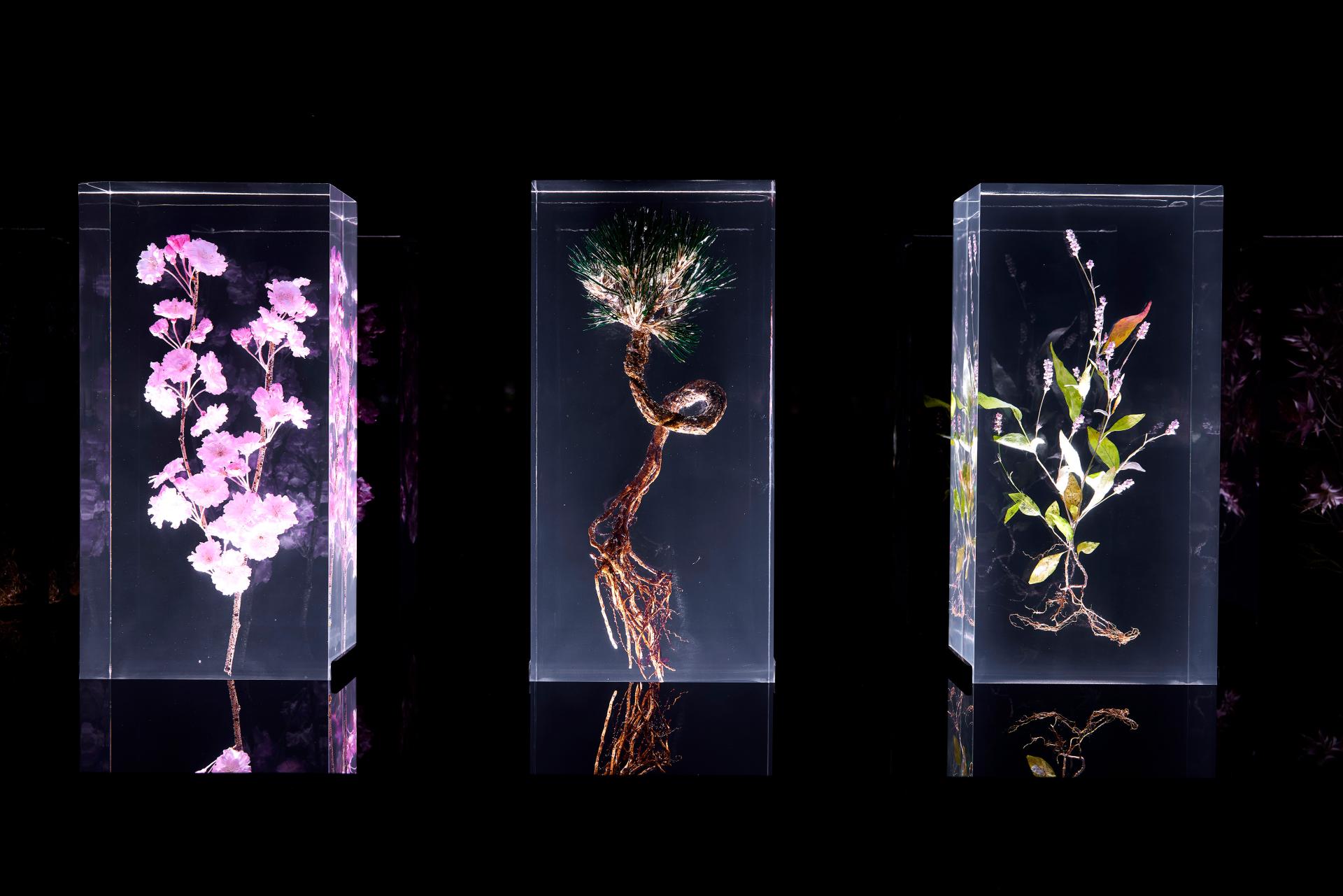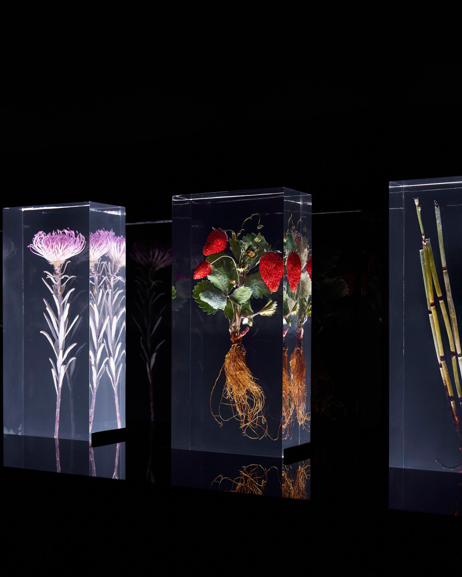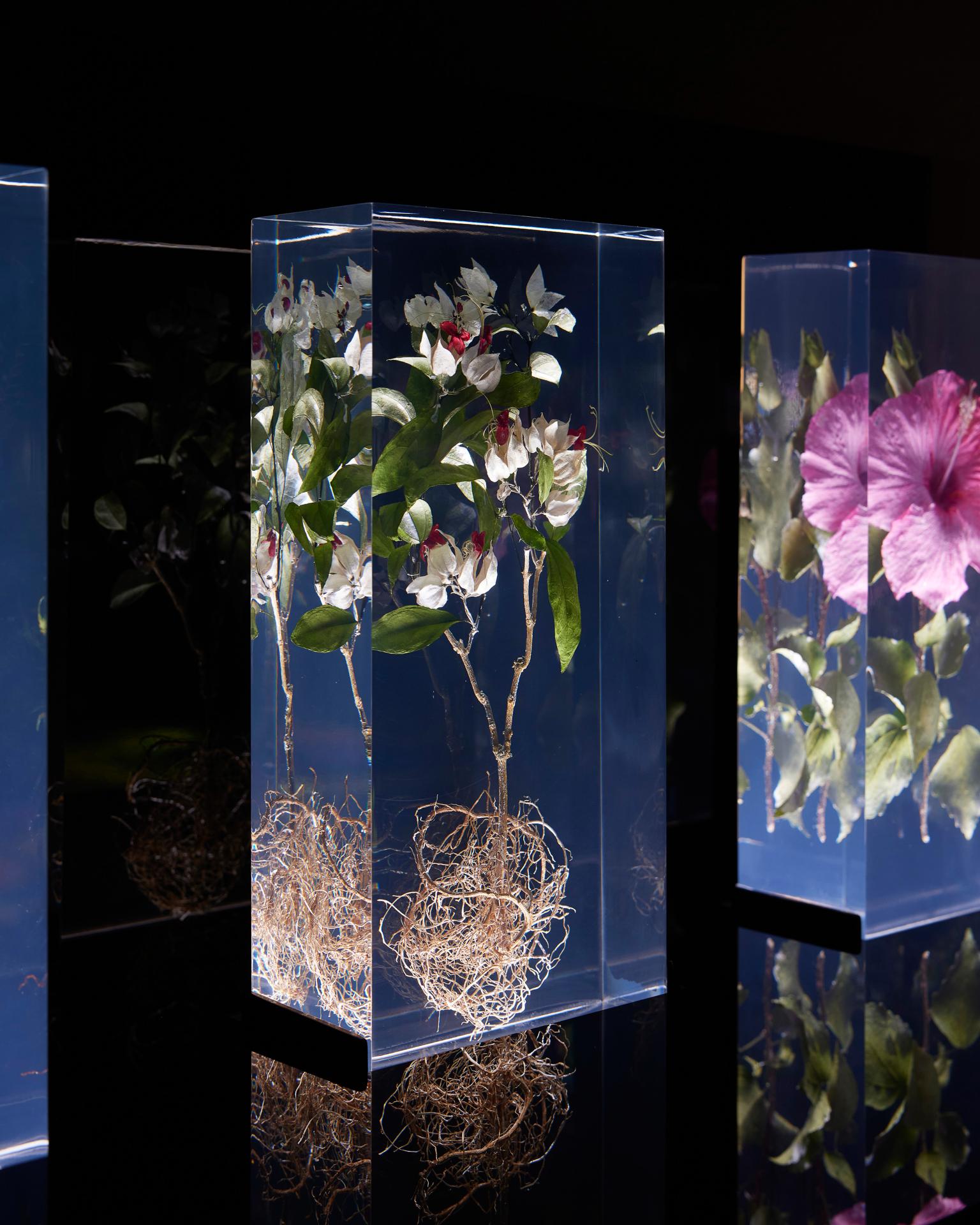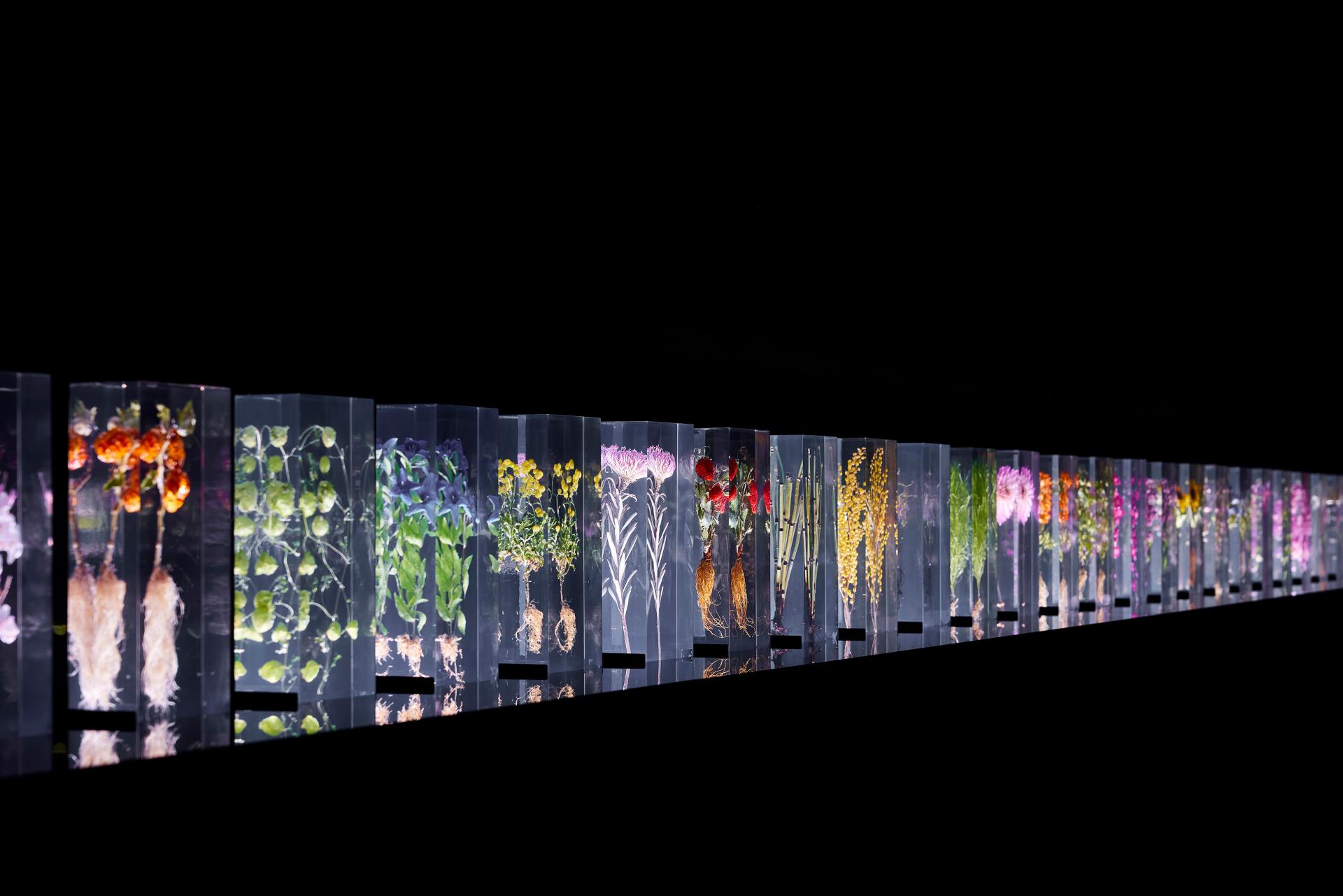 Defying the biological lifecycle of flowers and plants, the 130 resin-cast flowers in A Chaotic Garden reflect the existential urge to conserve beauty and resist decay. Held in an ambiguous state somewhere between life and death, Makoto’s Block flowers suspend biological specimens in time. Pausing the lifecycle of the flowers at the peak of their visual splendour, Block flowers allows us to appreciate the beauty of each species and contemplate the competing values of immortality and temporality.