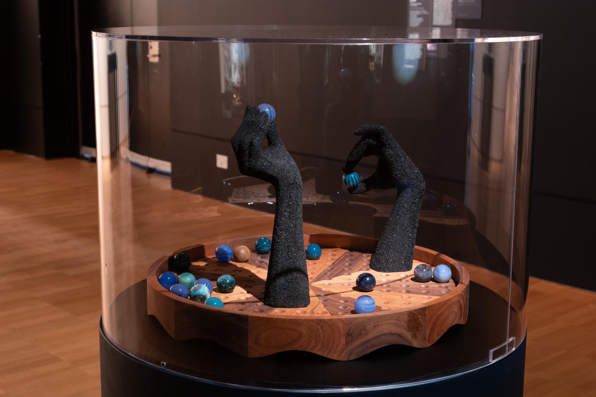 Ranging from painting and sculpture to installation and performance, Derek Fordjour’s exuberant and multi-layered works feature athletes, performers and other archetypes central to cultural rituals and communal rites of passage. This exquisite sculpture, Dual Acquisition, 2022, depicts a game of marble solitaire and is part of a recent body of work in which he explores magic as it relates to power and race throughout American history.