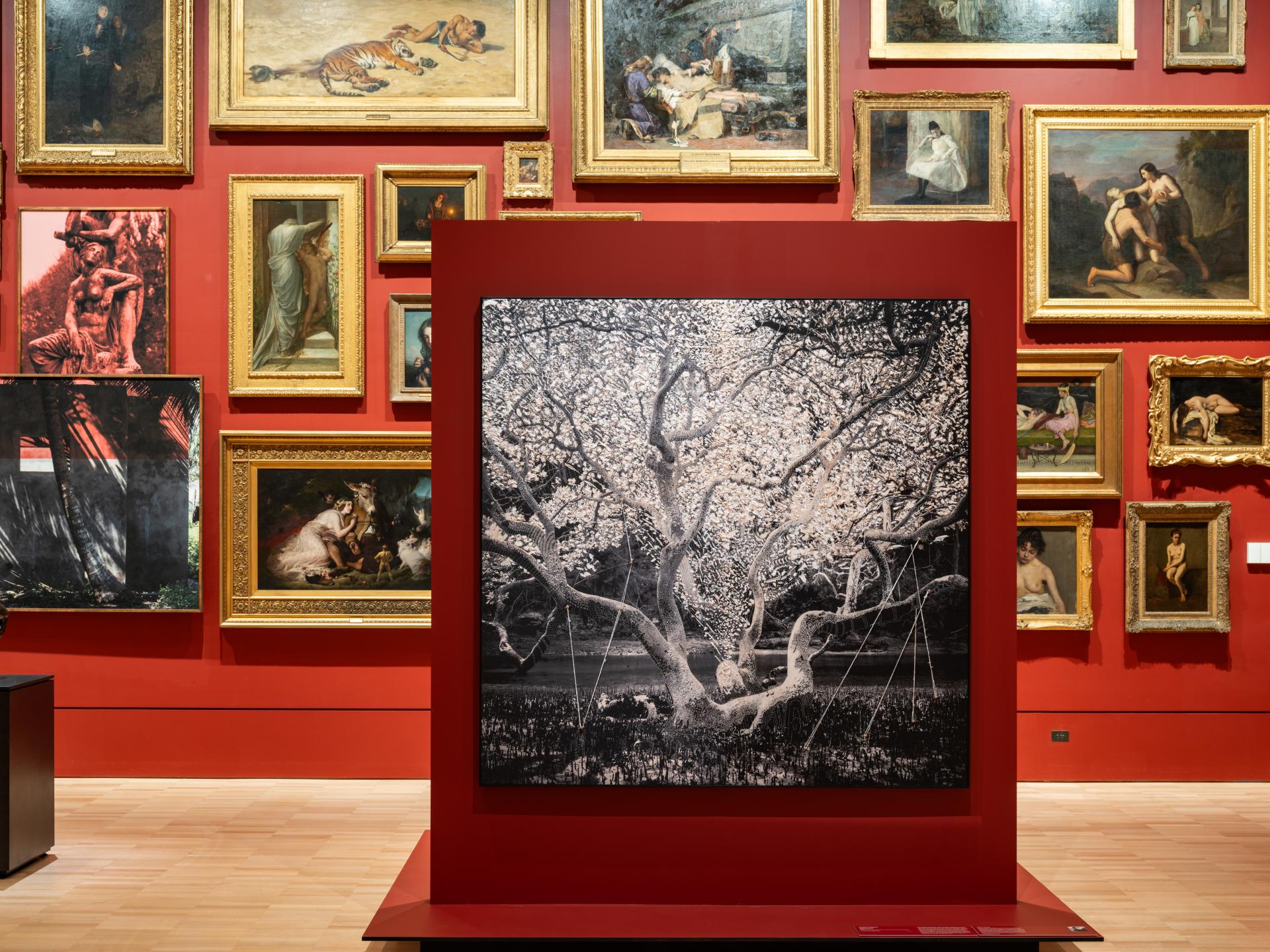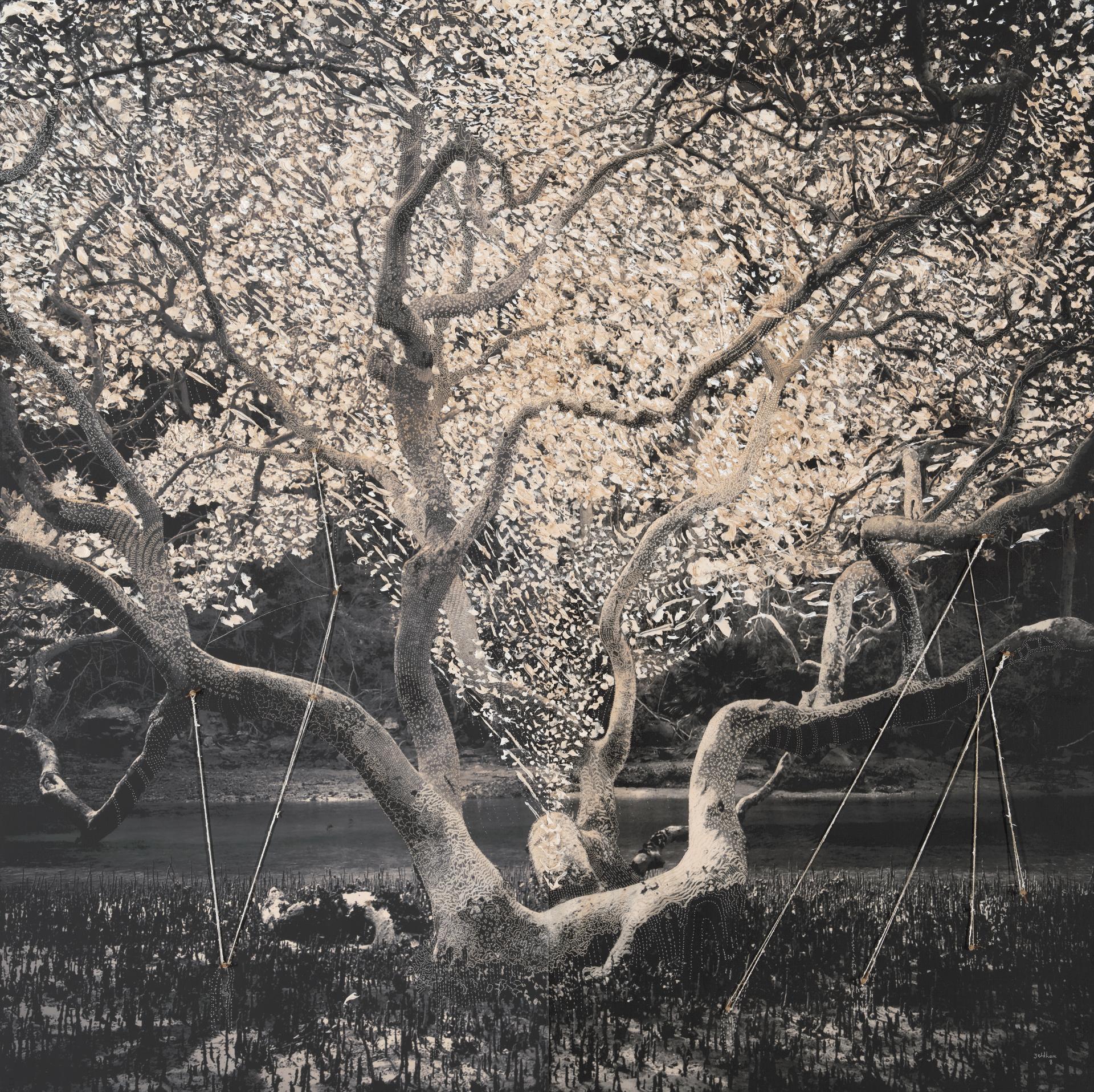 This intricately detailed image is of a grey mangrove tree on the Hawkesbury River, NSW. Joshua Yeldham has made art with this tree for sixteen years. He states that the old tree – maybe 150 years old – did not speak to him as a photograph. Yeldham said, ‘It was foreign as an image on paper. It was separate to me and I wanted it to be me’. To ‘become’ mangrove, Yeldham carved the surface of the image with a Dremel tool, letting the tip of the grinder meander up through the bark over and over, as a meditation. Each touch of the Dremel brought light. Yeldham explains, ‘I’m starting to make an offering. I’m starting to find illumination and reverence in something that I didn’t fully connect to, which was just a static image. And then I felt it was vulnerable, so I made strings that are holding it together, in case a storm comes. To care and bind’.