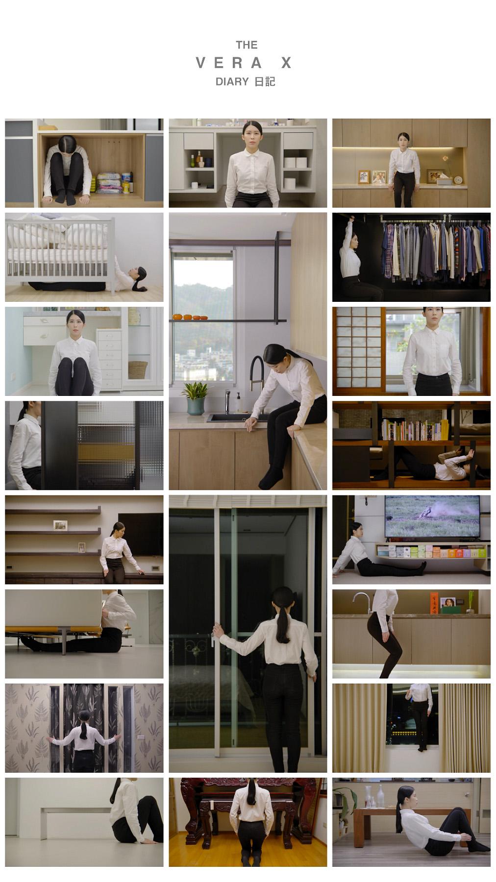 In her practice Joyce Ho deconstructs movements and fragments of daily rituals to explore the relationship between people and the space they inhabit. In her video work VERA X diary index, Ho depicts a protagonist in different idle spaces in a home setting. Scrutinising how she interacts with her temporary home, the work becomes a query about the balance between humanity and space. As she inserts herself into vacant spaces, the line between human and furniture blurs as both serve to balance each scene.