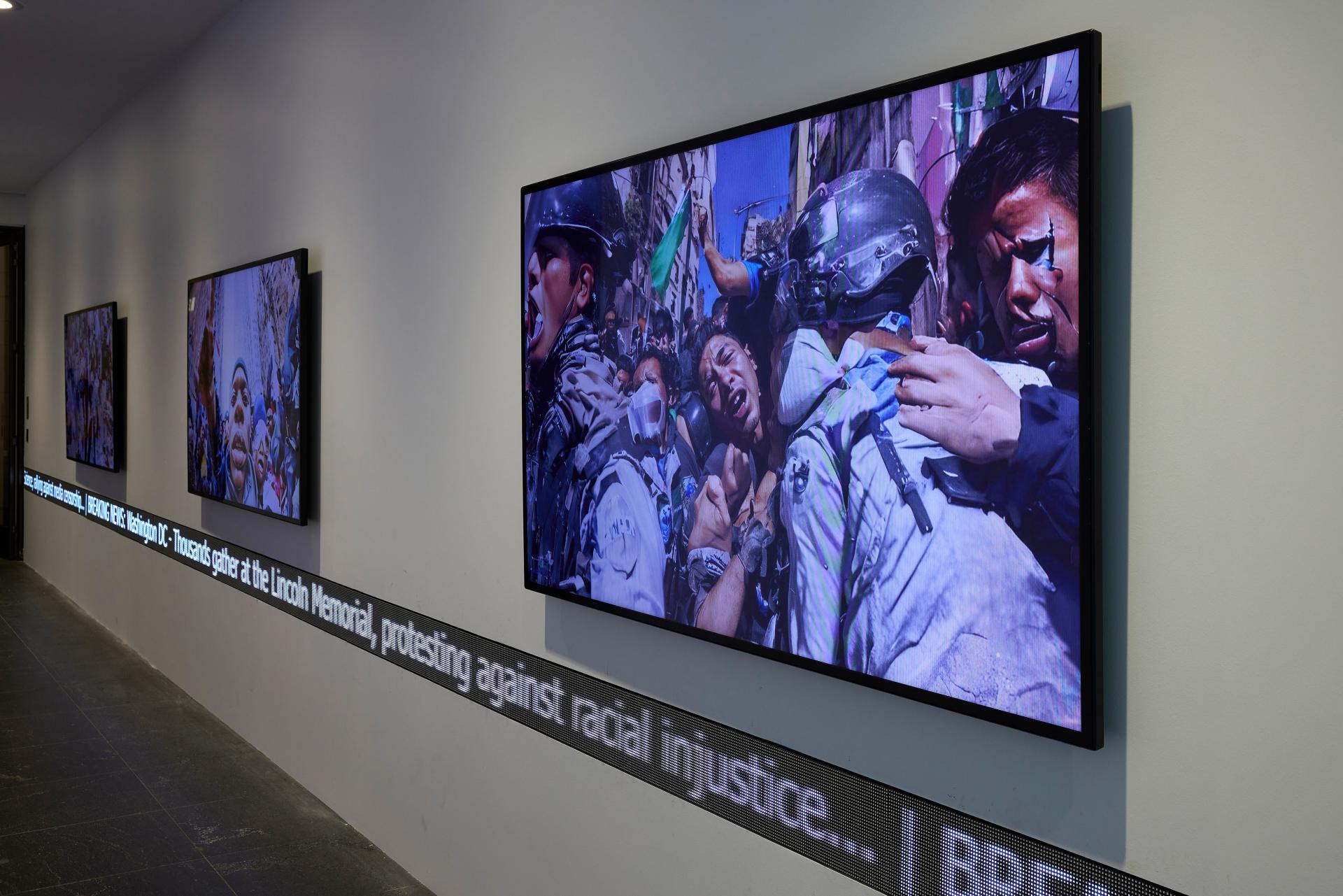Abosch’s interest in photojournalism is a starting point for his exploration of ‘synthetic photography’, specifically these deepfakes of scenes depicting civil unrest across the world. It is unclear at first glance if these are scenes of past riots and protests or if they are breaking news. For Abosch, they can be seen as future news.