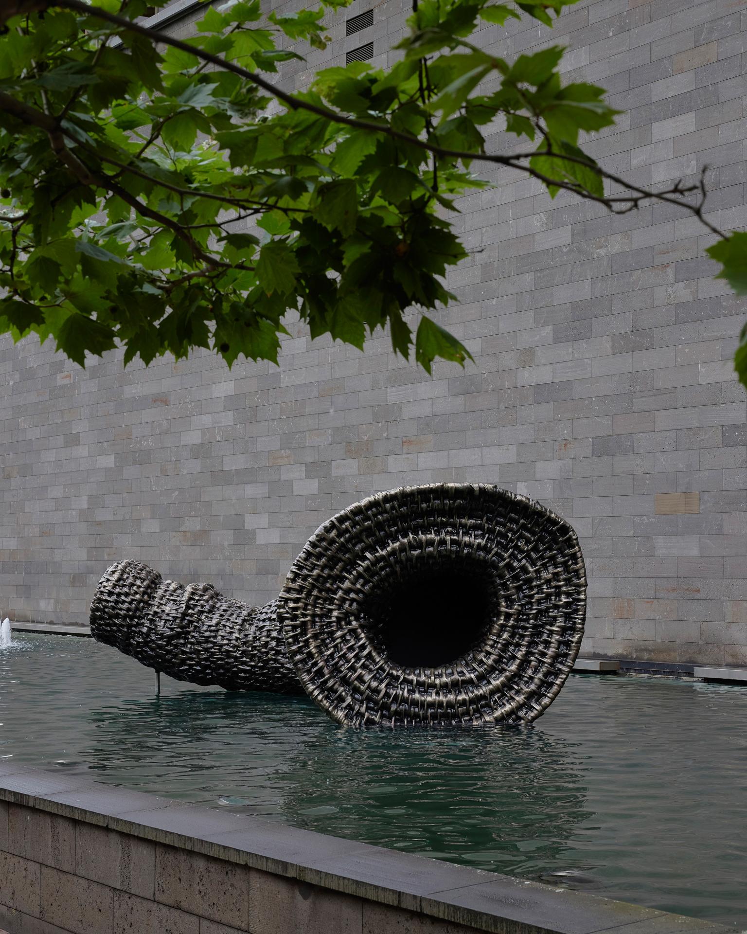 Aunty Kim Wandin’s sculpture Iuk bagurrk gunga, meaning ‘eel women catch’, is a tribute to the remarkable history of Wurundjeri women, their matrilineal tradition of weaving, and their relationship with the short-finned eel, known as iuk. The sculpture highlights the migratory paths of these eels, which today traverse sewers and underground waterways across and beneath Naarm/Melbourne. Wandin’s bronze sculpture is cast from a woven form that the artist created in 2023. Iuk bagurrk gunga is comprised of bronze segments that have been brought together to form a unified piece. The eight-metre-long sculpture exudes a remarkable sense of fluidity and motion, capturing the essence of this traditional fishing tool that holds such significance in Wurundjeri culture.