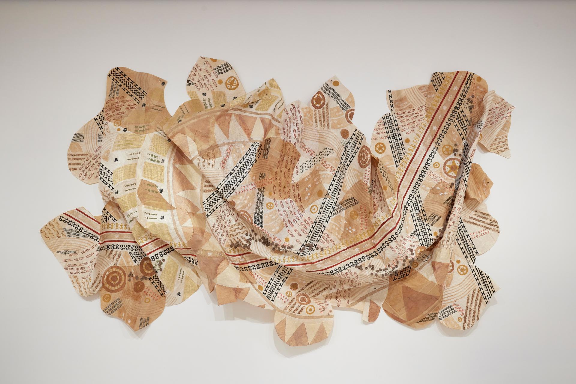 Mele O Nā Kaukani Wai is a mixed-media, wall-based installation that speaks to the importance of integrating Indigenous traditional ecological knowledge and Western science in the fight against global environmental crises. Lehuauakea uses traditional ʻohe kāpala (carved bamboo printing tools) to print patterns that tell stories through intergenerational symbolism. The patterns use the metaphor of the mixing of freshwater and saltwater, where the river meets the sea to portray this complex issue. The work envisions a more ecologically equitable collective future through a contemporary Native Hawaiian lens.