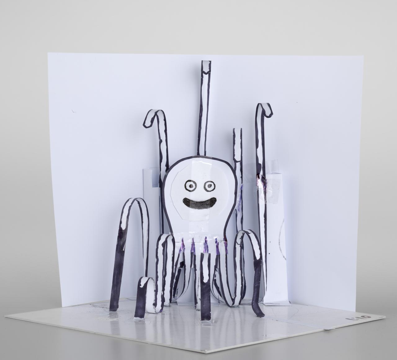 Early sketches created by Wood responded to this prompt and illustrate the development of her project from research and conceptualisation through to schematic and final design. Wood has developed ongoing collaborative relationships with master craftspeople and manufacturers. The custom-designed timber veneer that lines Kaleidoscope-o-rama bookcase, 2023, was fabricated at the ALPI wood veneer factory in Italy, a process documented via photographs and video. The ALPI artisans used a scale model by Wood to fabricate the materials.