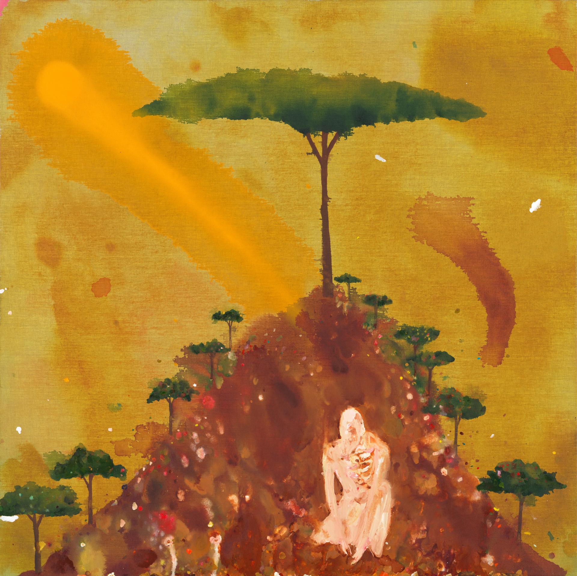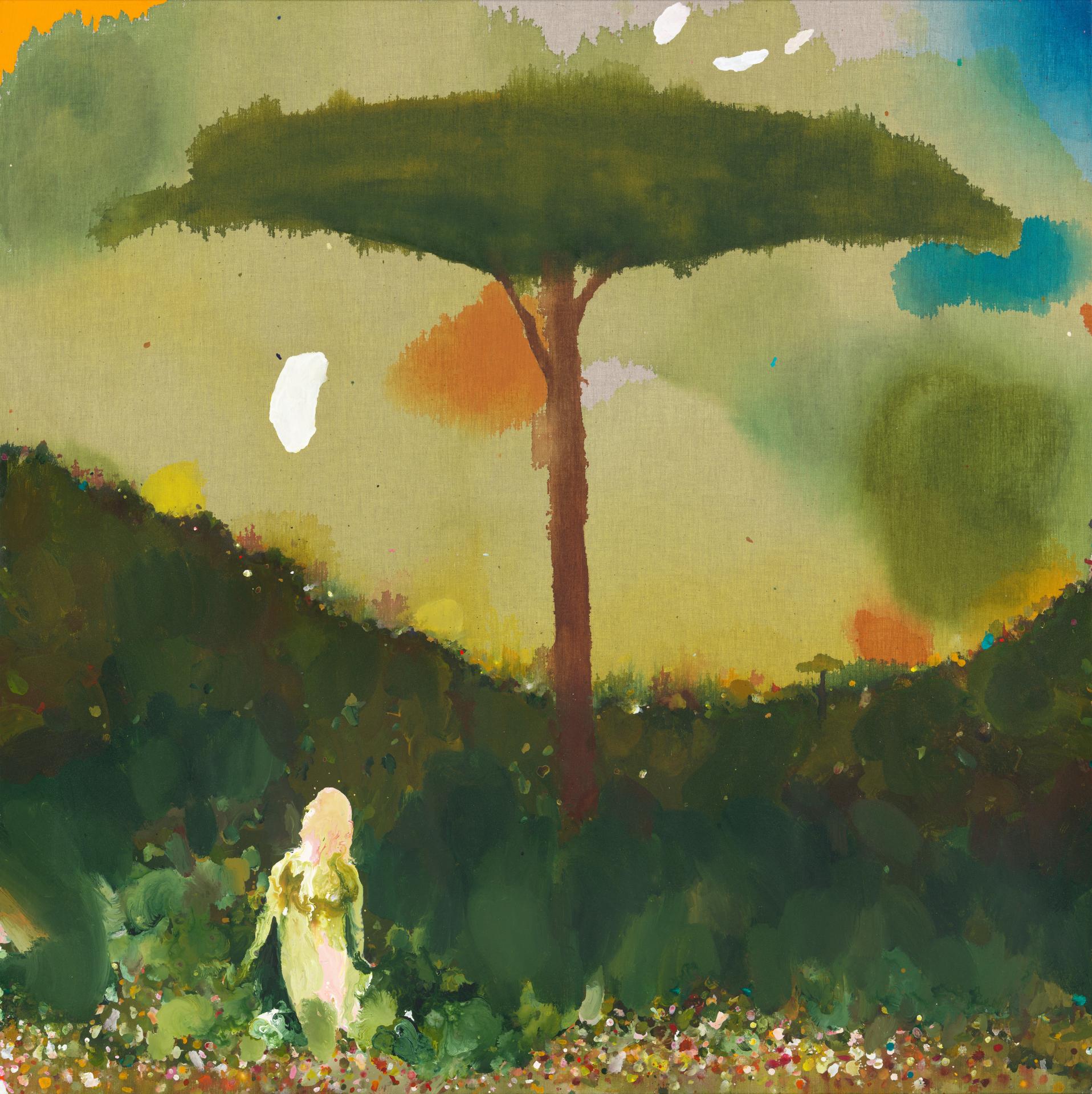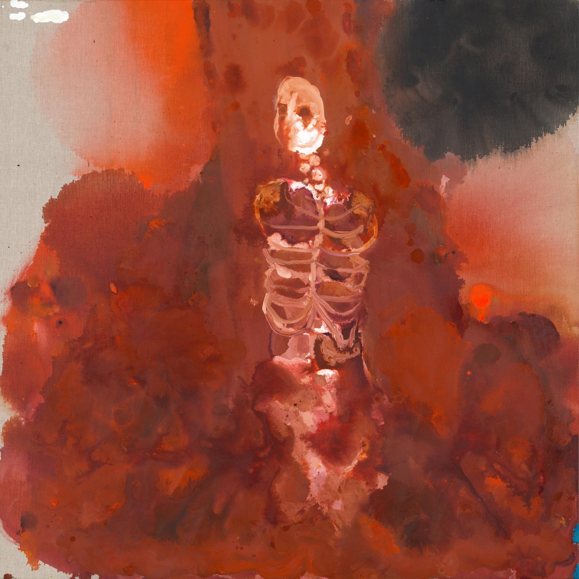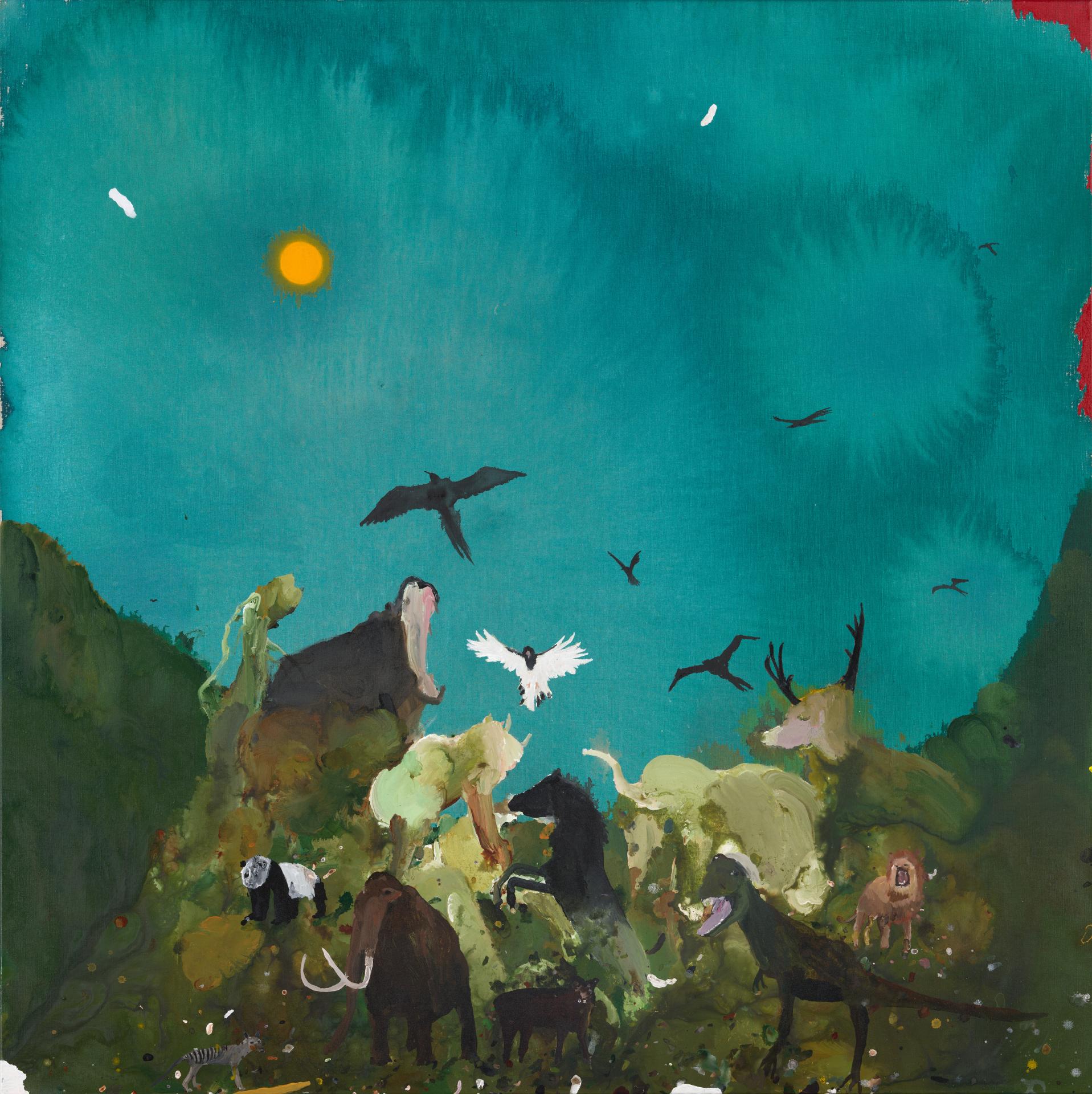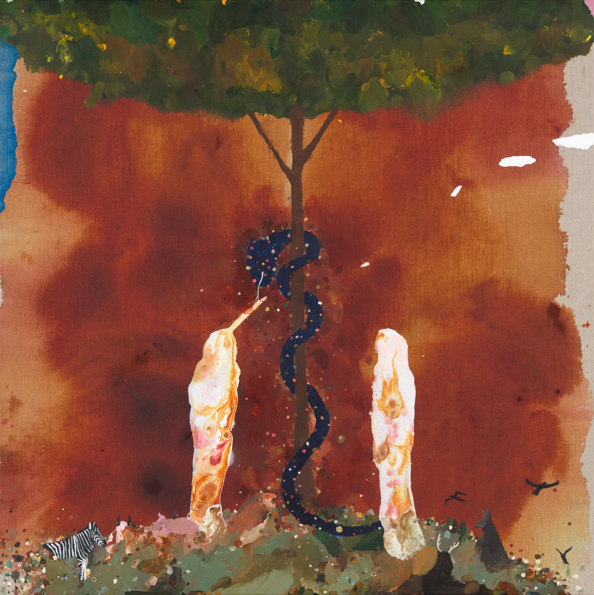 Each painting in Lewer’s series represents a chapter or section of the Adam and Eve myth, where figures and elements, such as the serpent and animals in the Garden of Eden seem to emerge from Lewer’s staining of the unprimed canvas. The stain – also a metaphor for evolution – takes its own shape, depending on the application of paint and its dilution. The paintings include allusions to the current climate crisis and global conflicts among others, built up through further staining and layers of paint.