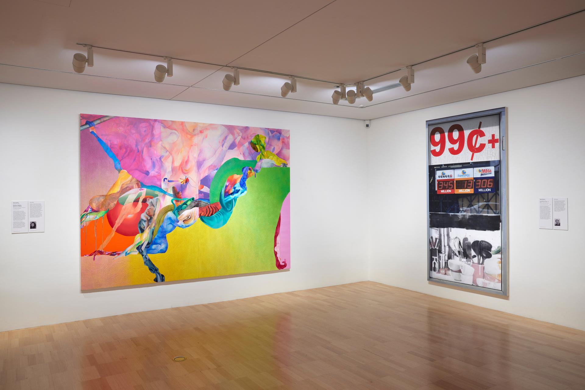 Sayre Gomez’s hyperrealist paintings explore the tenuous relationship between our everyday surroundings and increasingly manipulated digital culture. Everything must go, (1) depicts a run-down shop window covered with the remnants of old advertisements, past remains of spectacle and newness. Gomez presents Los Angeles as a site of urban decay and commercial nostalgia, distinct from the romanticised and mythologised images often seen in representations of the city. His work is semi-fictionalised, employing a diverse set of techniques, including trompe l’oeil (deceive the eye), airbrushing and Hollywood set-painting methods. In Everything must go, (1), realistic reflections of passing cars complicate the painting’s surface and act as reminders of the urban setting.