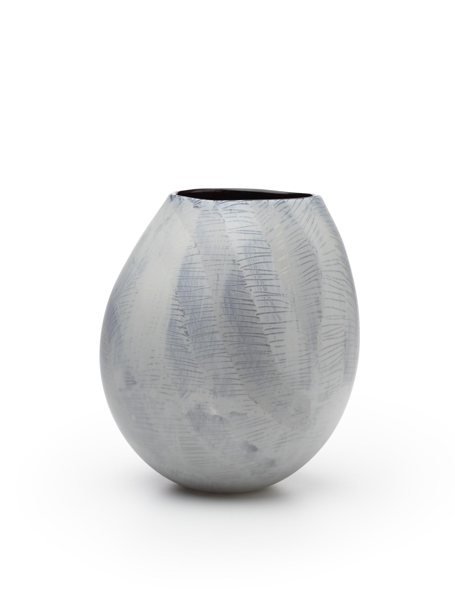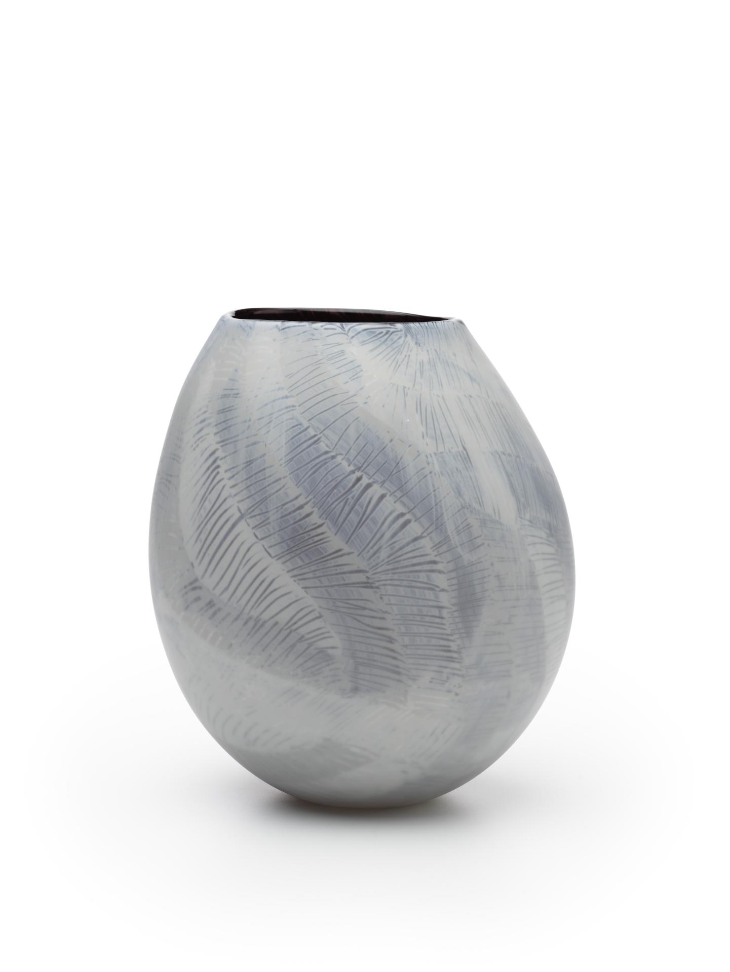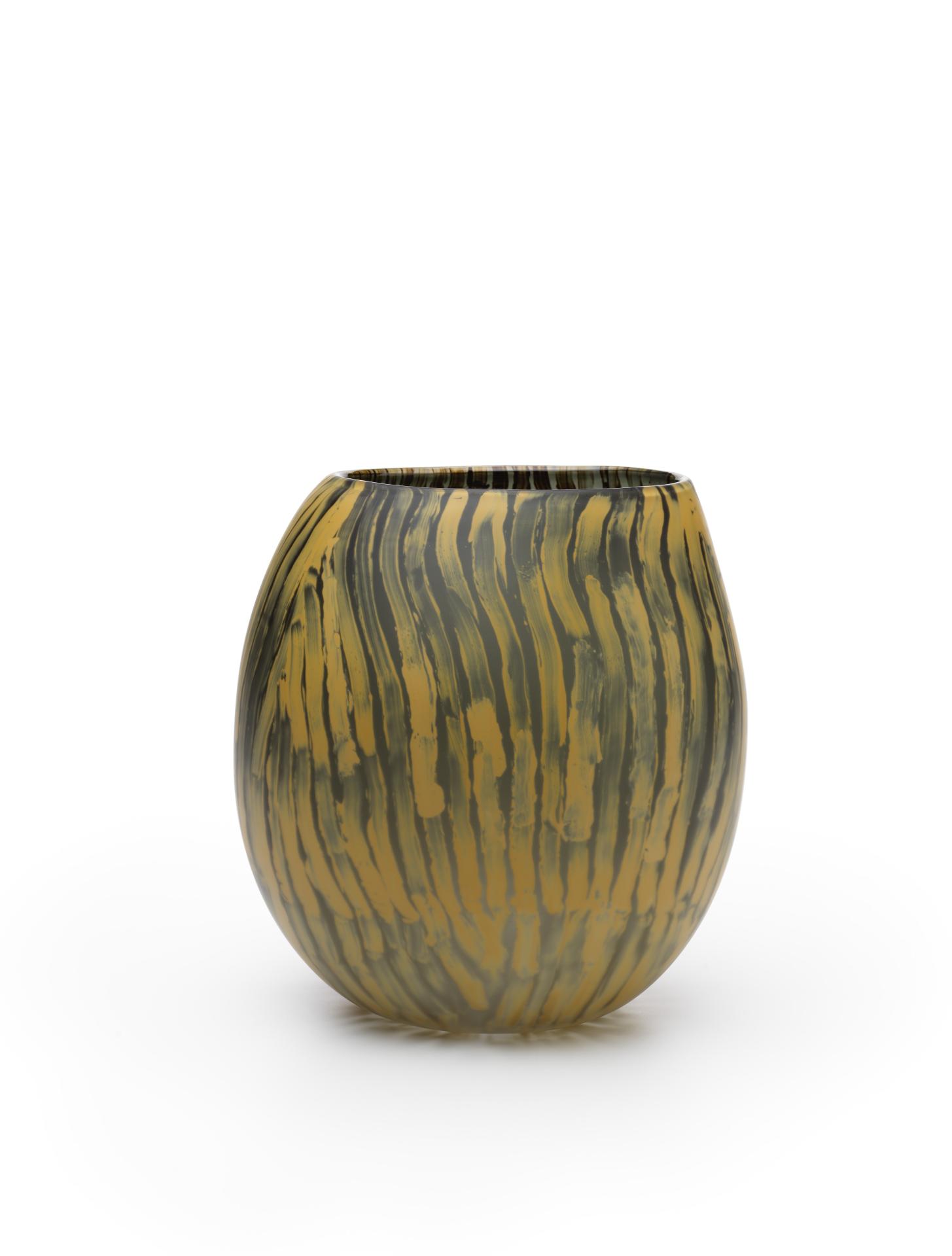 Selinda Davidson created this series of glass vessels as part of her mentorship with South Australian glass artist Clare Belfrage in JamFactory’s glass studio. The hand-worked surfaces of the vessels feature Davidson’s highly textured linear paintings and are the culmination of her experiments and explorations into the medium of glass as a mode of cultural expression. Davidson makes design (walka) inspired by traditional mark-making and tjukurpa (ancestral stories) that for this series inform the design of each vessel.