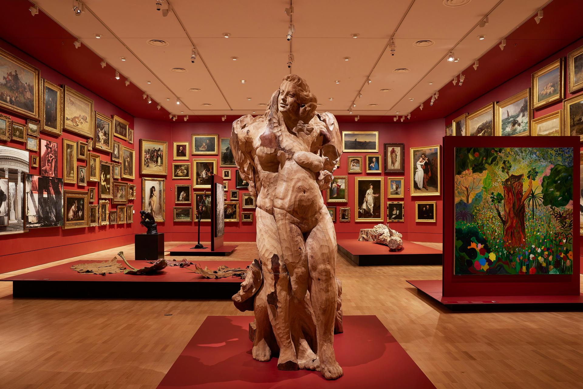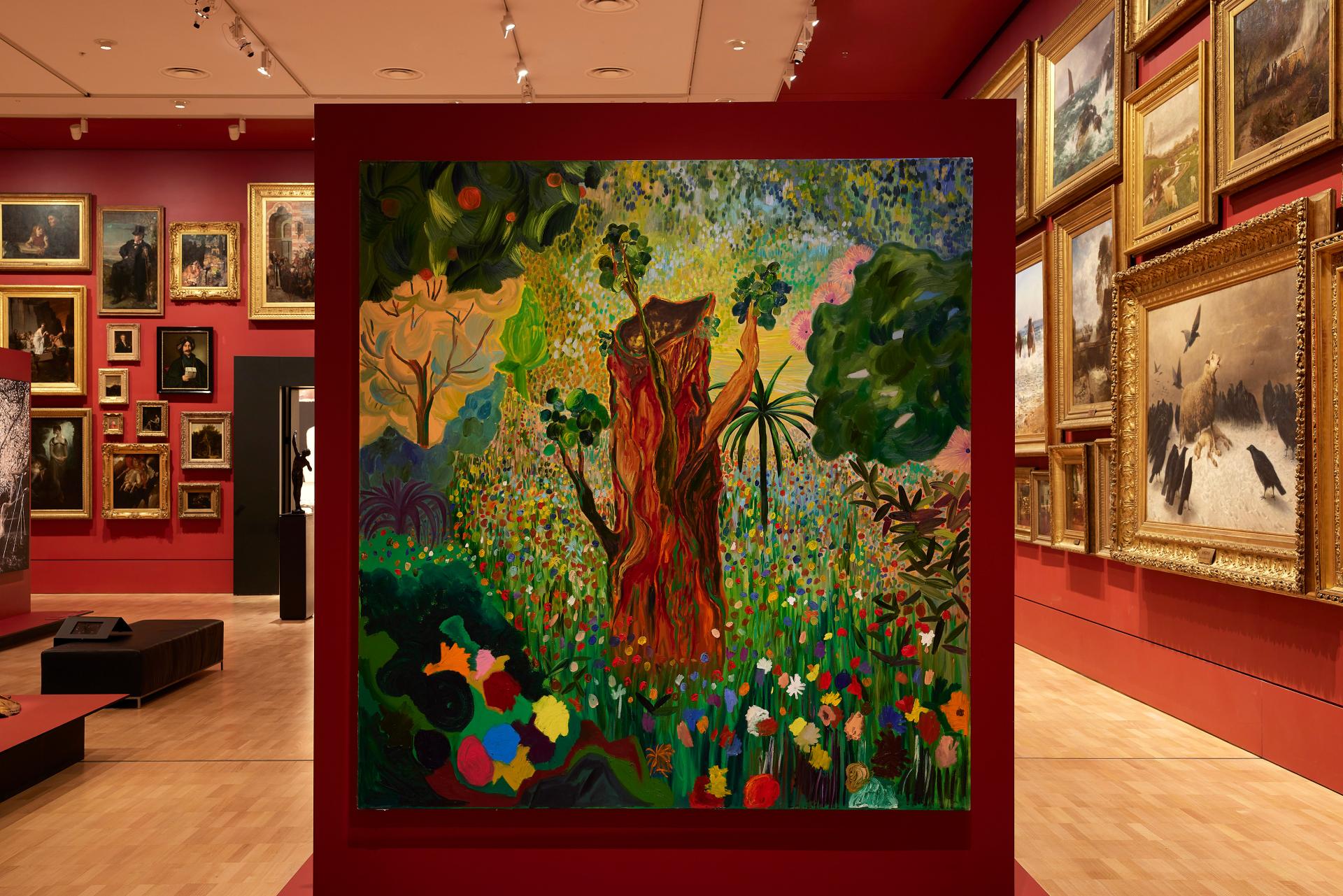 Depicting imagined landscapes, Shara Hughes views her works as reflections of her psychological interior world. She suggests that a single flower might be ‘a self-portrait, while a landscape feels more like a zoomed-out view of what’s going on personally or emotionally’. Hughes uses abstract and representational imagery, depicting natural motifs, snake-like trees, reflections of bodies in water and night skies alongside abstracted, undefined forms. Her technique, in which she mixes pigment on the canvas surface, is reminiscent of a range of art historical references, including Post-Impressionist and Colour Field painting.