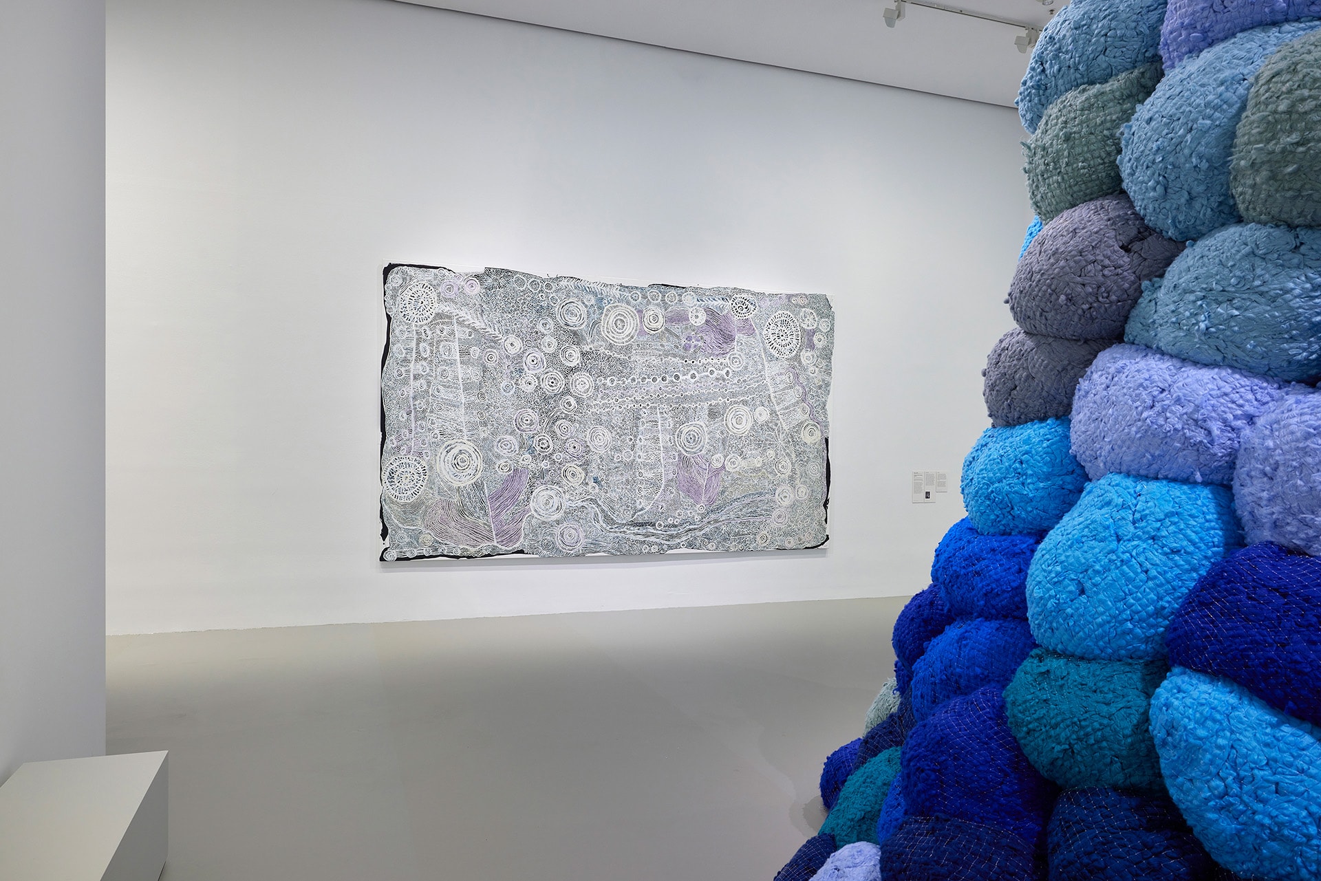 Betty Muffler’s Ngangkari Ngura (Healing Country), 2022, is painted from above, with the canvas placed on the ground. The epic scale of the work provides an expansive representation of Country from the perspective of the eagle, including significant sites such as waterholes and waterways. The work is informed by the artist’s status as a ngangkari (traditional healer). Embracing a subtle monochromatic palette, the movement and energy in her painting comes from the activation of the eagle spirit. In her own words, ‘Through my paintings, you can see my Ngangkari work: watching over people and also looking after Country. My Country. This place is very important – we all need to look after each other and respect our home.’