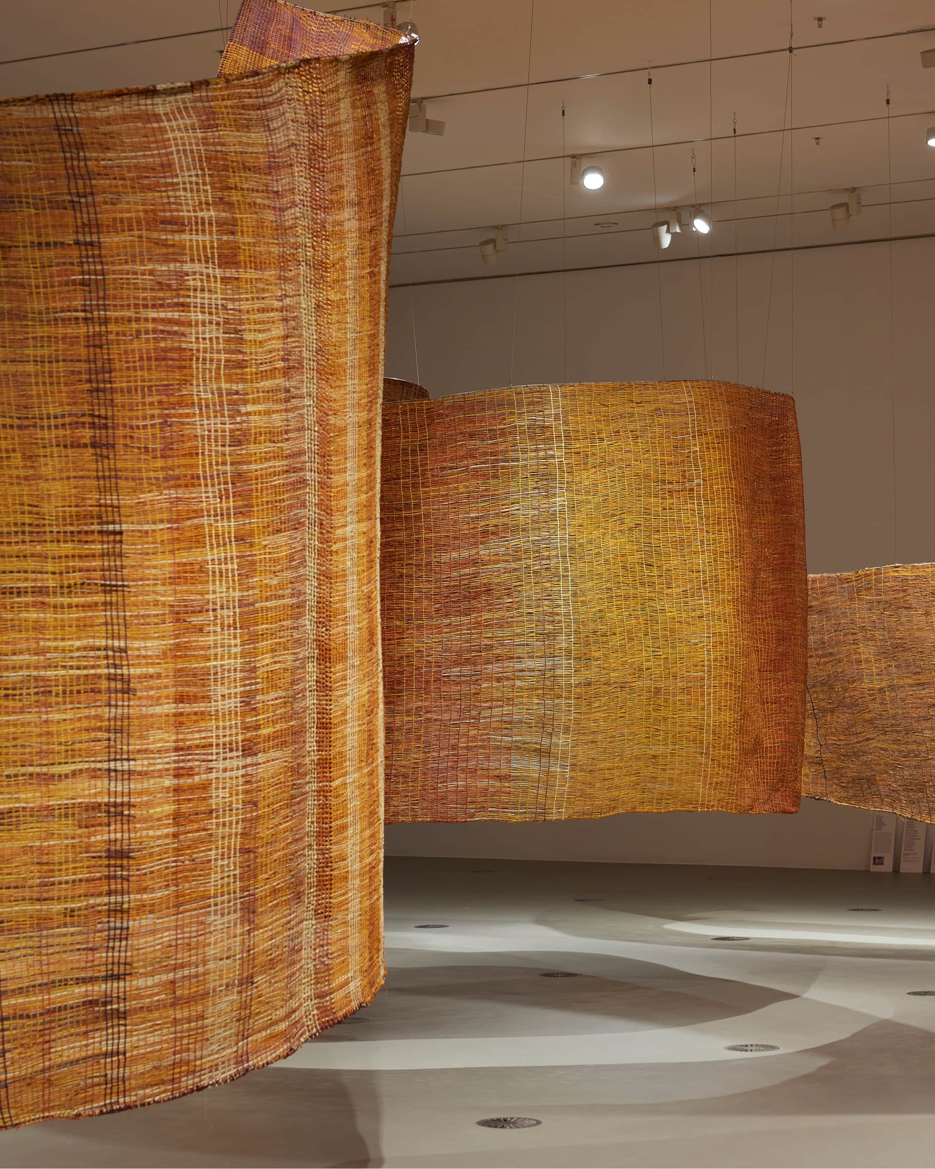 Weaving is one of the oldest human crafts – a timeless, fundamental art form that has defined the way human beings interact with the world around us. The Community of Maningrida in Central-West Arnhem Land has long been home to a rich and vibrant cultural heritage, through bark painting, sculpture and weaving. Mun-dirra is an immense, 100-metre-long, multi-panel woven artwork that symbolises the extraordinary possibilities of the human mind and spirit. The beauty and ambition of this major installation, having taken almost two years to produce, reflects the creativity and collaboration that underpins Burarra art and culture. It is simultaneously a contemporary artwork and a form of cultural continuity representing a relationship to land and water that defines Burarra life. For Burarra women, weaving is not just a means of creating functional objects, it is also a way for individuals to express their identity and cultural heritage.