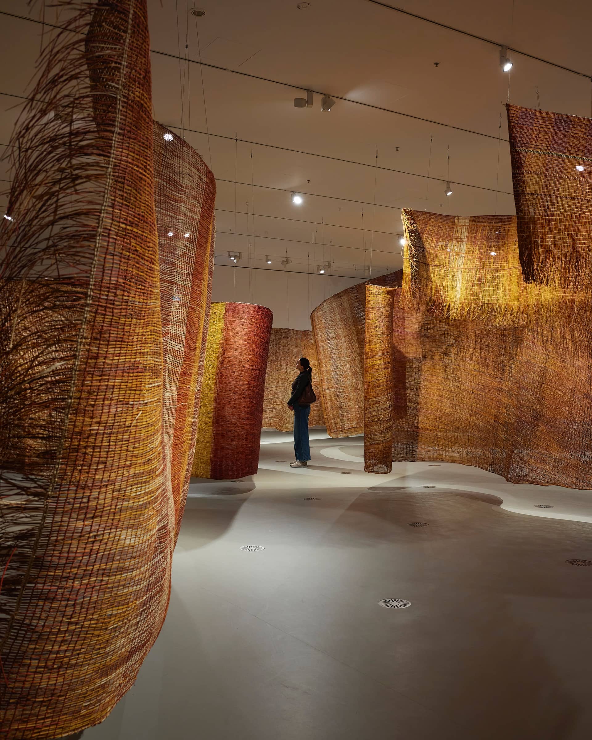 The Community of Maningrida in Central-West Arnhem Land has long been home to a rich and vibrant cultural heritage, with a particular strength in the tradition of weaving. For generations, Burarra people have been creating beautiful and intricate an-guchechiya (fish trap), burlurpurr (bathi or dilly bags) and bamagora (conical mat/women’s skirt used for ceremony), as well as many other woven items. Burarra women from Maningrida use natural materials such as gun-menama (pandanus leaves), burdaga (kurrajong) and various bark fibres to produce their work. In 2021 the NGV through the Lisa Fox Commissions Series commissioned the largest woven sculpture ever produced in Australia, Mun-dirra, 2023.