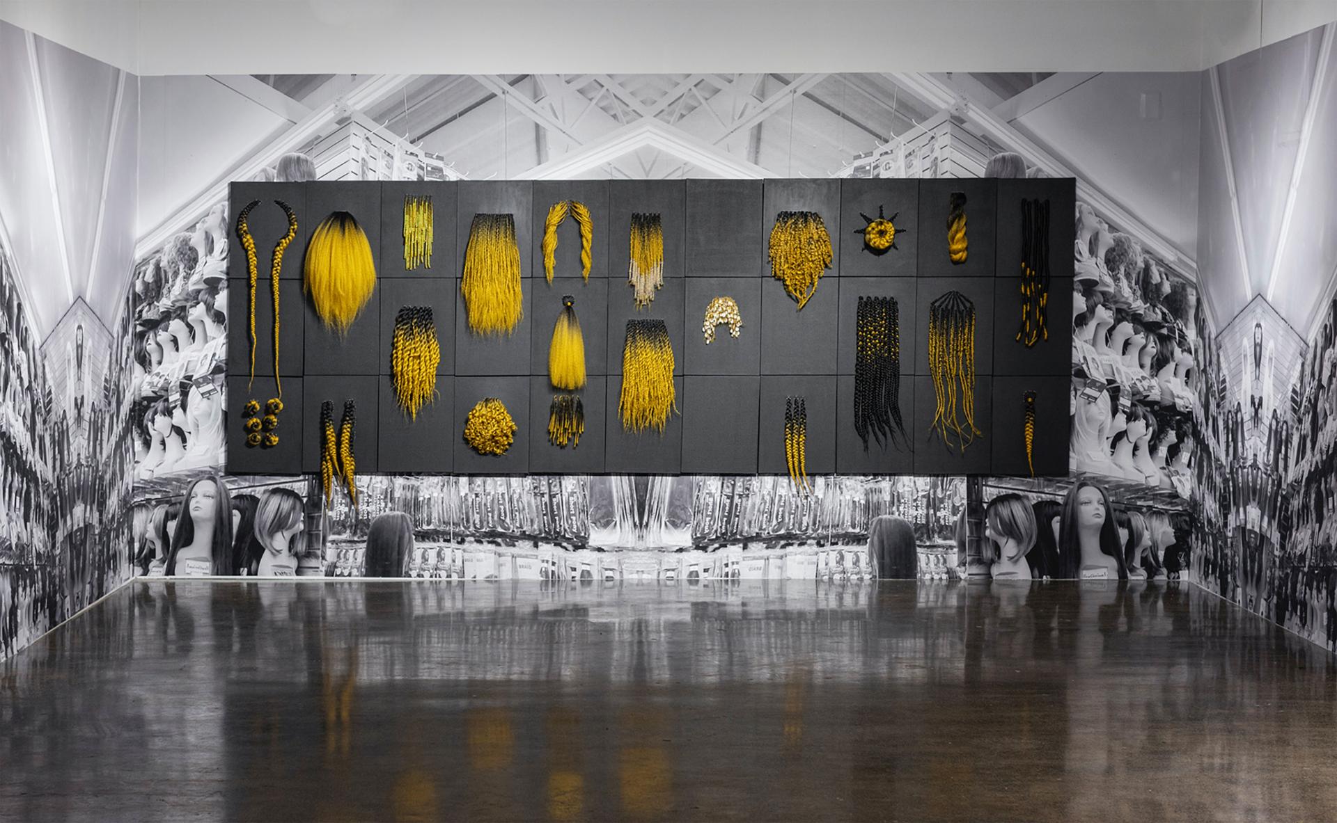 Challenging the capitalist colonisation of Black beauty and identity, Tiff Massey rejects the Eurocentric aesthetics in advertising aimed at Black women. Each of these twenty-two traditionally Black hairstyles is a testament to the cultural significance of Black hair, an emblem of resistance and resilience. Massey’s tableau unfolds against a backdrop image of a salon, teeming with white mannequins – a reminder of the beauty industry’s pervasive use of Caucasian models to peddle products for Black women. I got bundles and flewed out is a critique of marketing strategies that surreptitiously invalidate the Black aesthetic in favour of a Eurocentric ideal. It asks the viewer to grapple with the uncomfortable truth of the pervasive racial bias inherent in our society’s beauty norms.