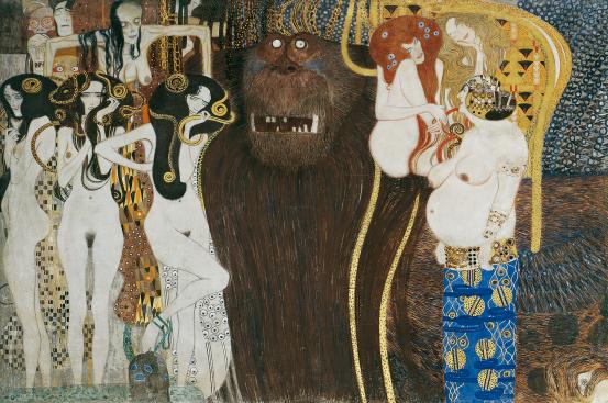 The Beethoven Frieze celebrates the victory of the human spirit through painting, sculpture, music and poetry in Klimt's realisation of the Secessionist ideal of Gesamtkunstwerk (the total work of art).