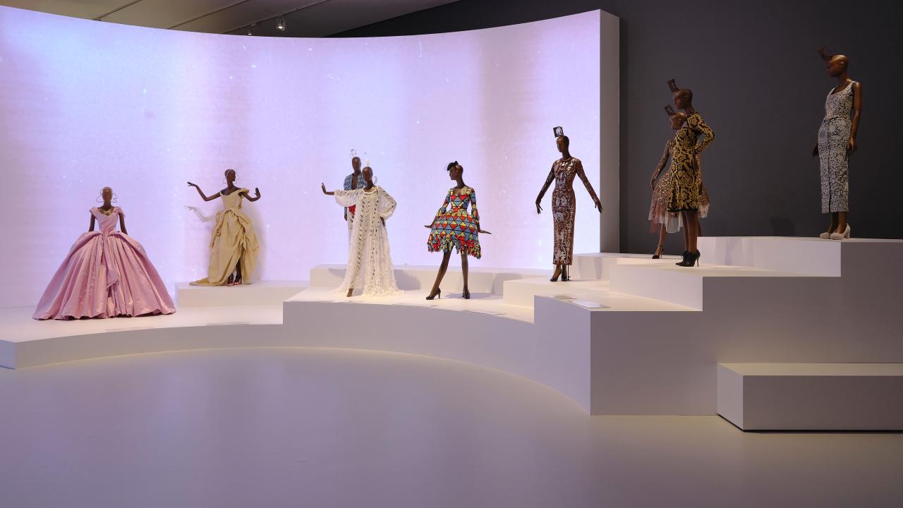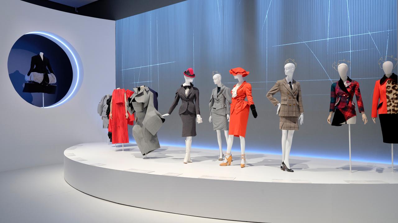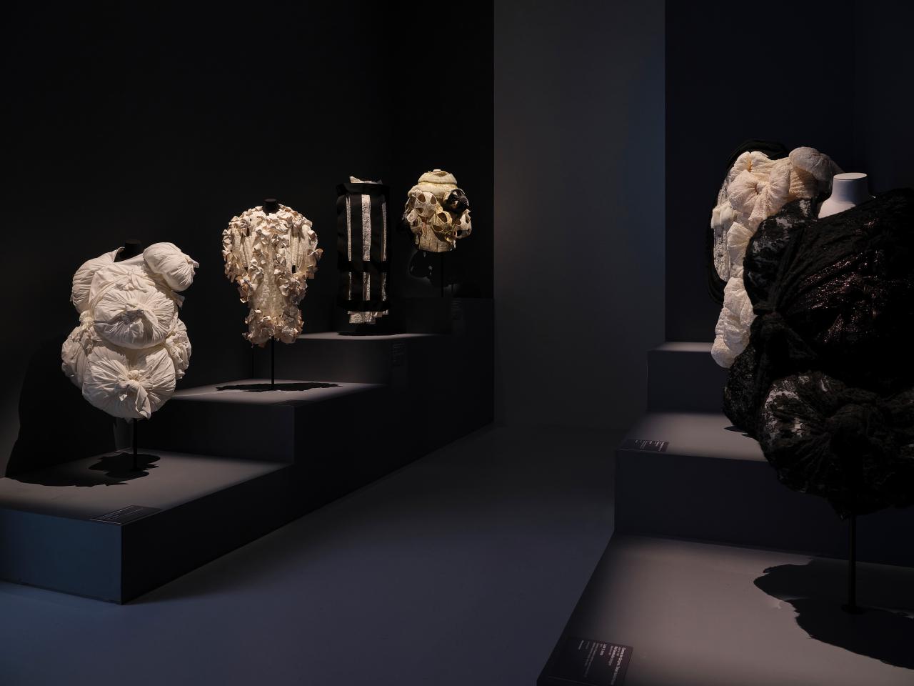 At the far end of the room, mannequins are presented on honeycomb-shaped plinths two levels high against a black wall.