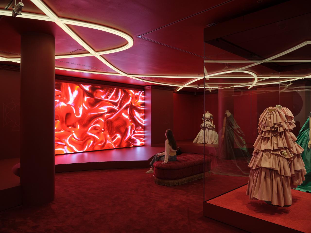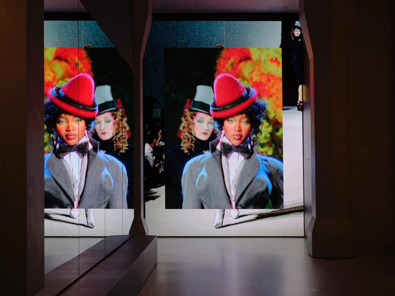 A small room with a large LED screen showing dynamic and fast-moving runway footage that includes flash photography and fairly loud music. There is a display on plinths on the right-hand side and a bench seat on the left-hand side. The exhibition continues around to the left.
