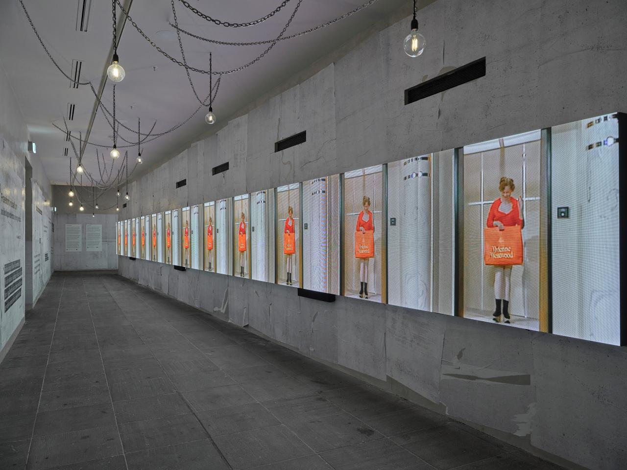 Around the outside of the room, mannequins are presented in nooks with mirrors. Six screens are embedded in between these displays. Background music plays.
