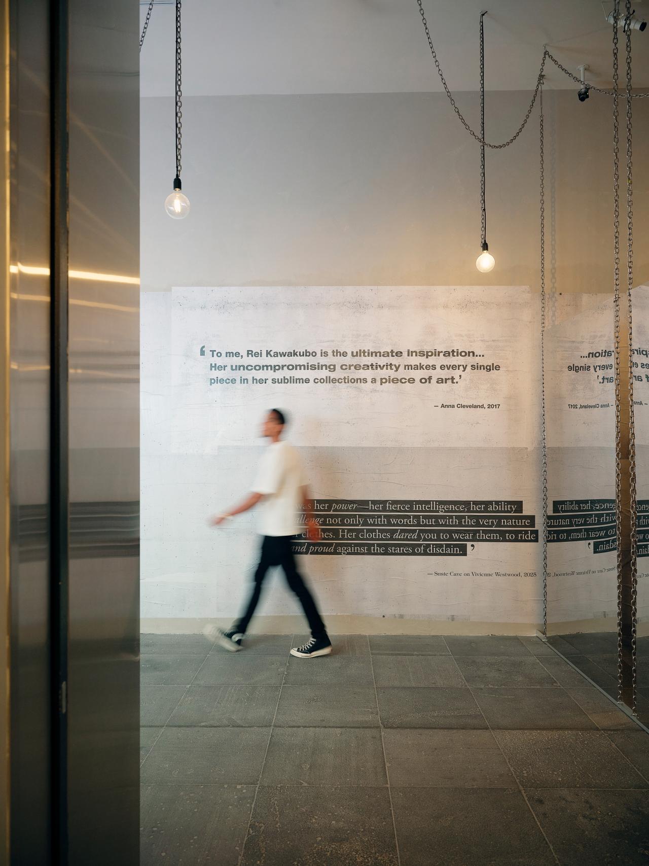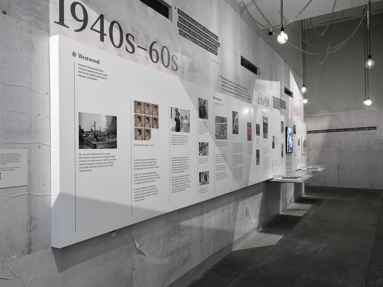 Another corridor leads you towards the next space. On your left-hand side is a timeline featuring photos, written information and some small video screens. Interview and runway footage is shown with captions. Quotes from both designers are printed on the wall on your right-hand side.