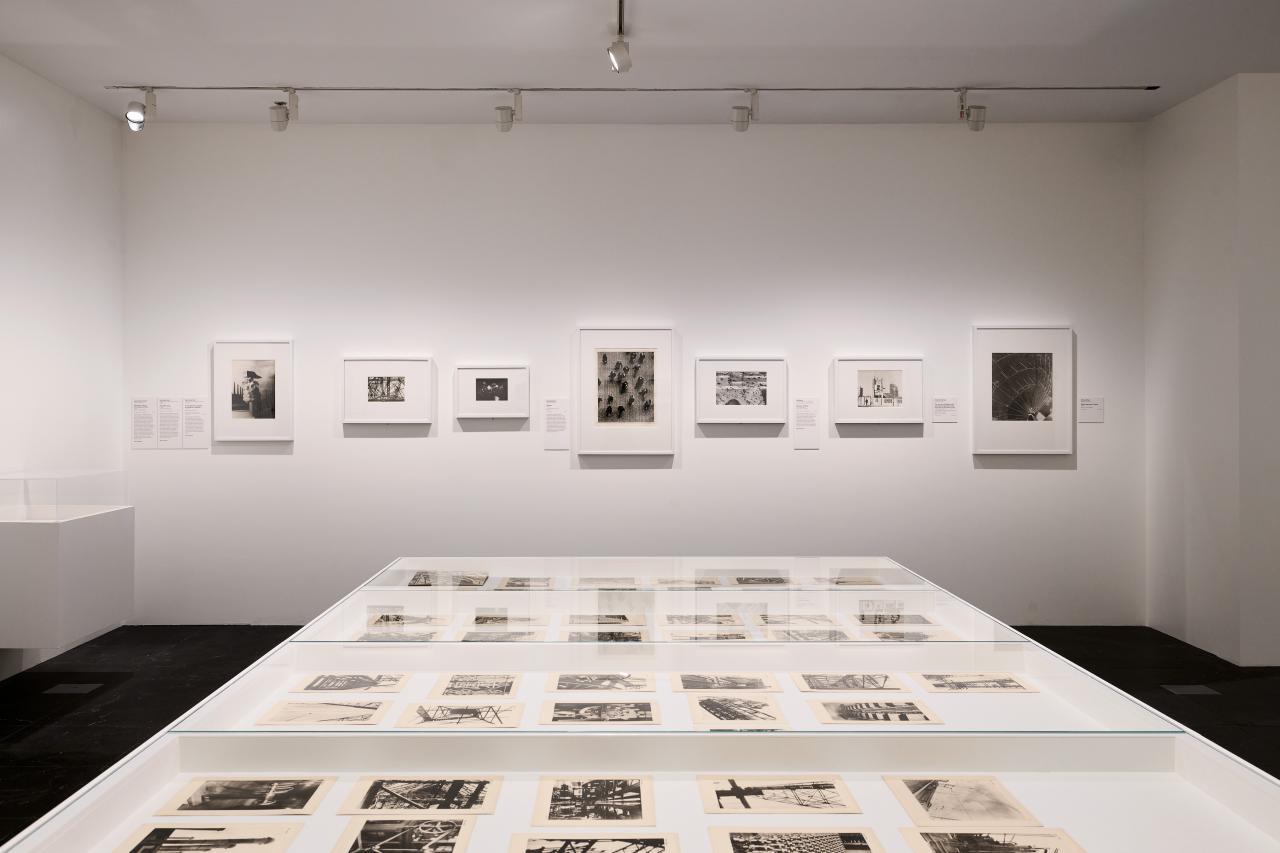 Photography artworks are displayed on the walls and in display cases. There is one small moving image screen without sound.